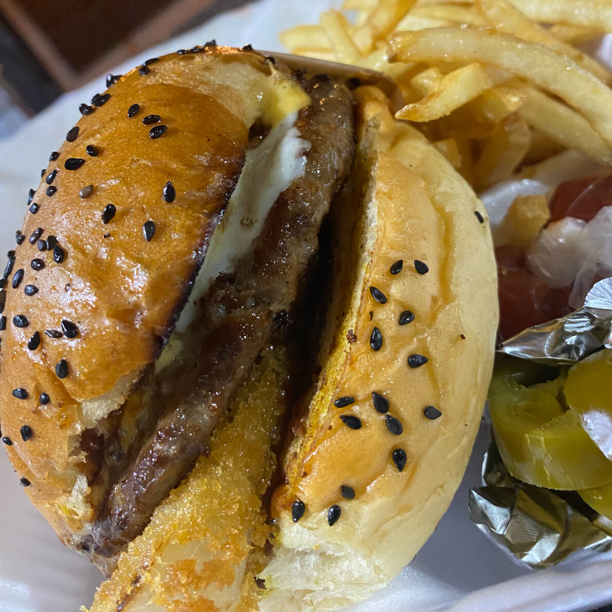 Sirloin de res, queso amarillo, tomate, cebolla, lechuga. Acompañado de papas fritas