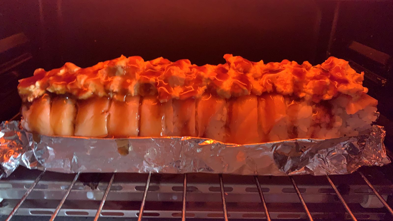 Por dentro philadelphia, aguacate y res, por fuera gratinado spicy con chile serrano y tocino, bañado en salsa de anguila.
