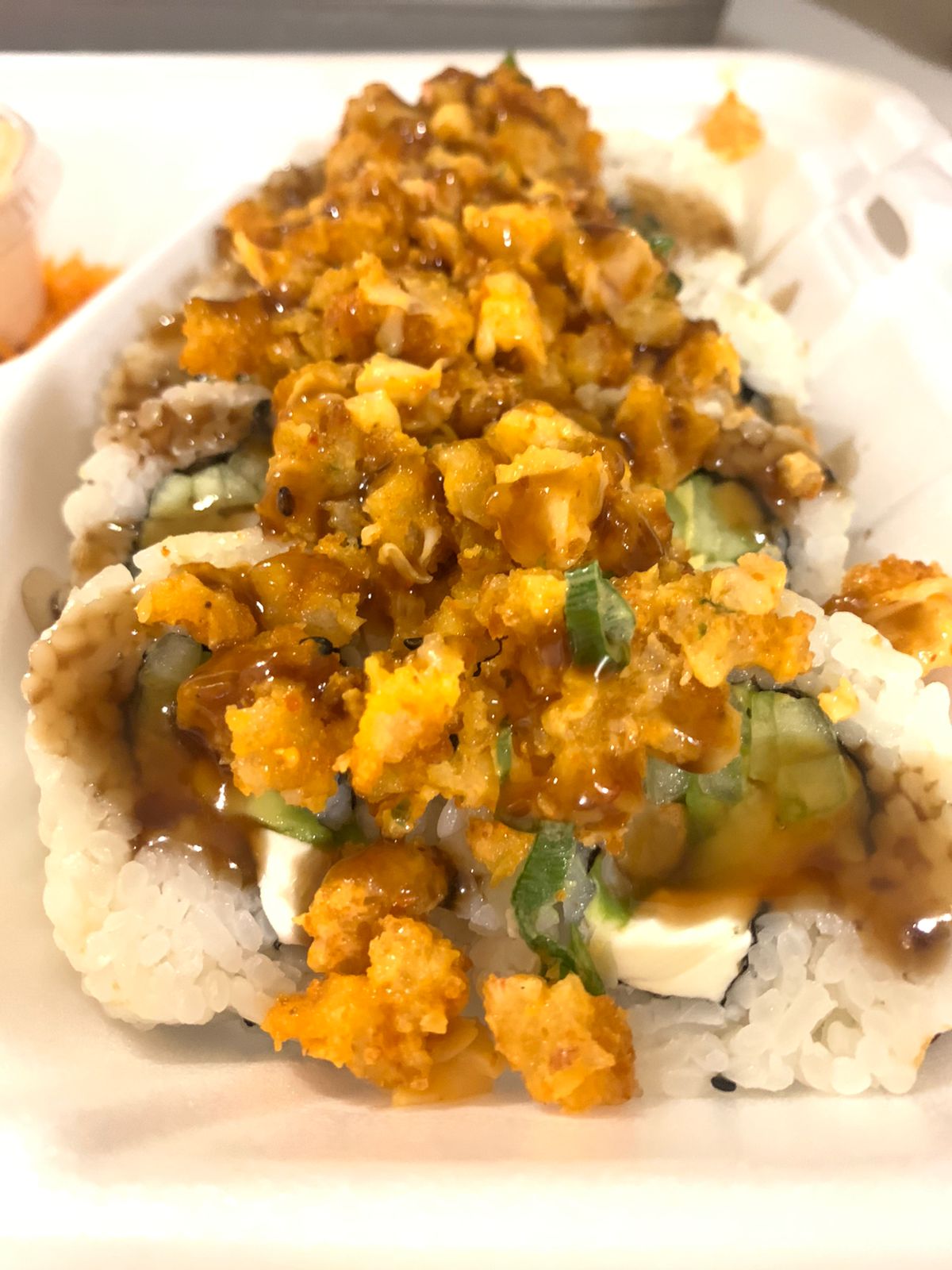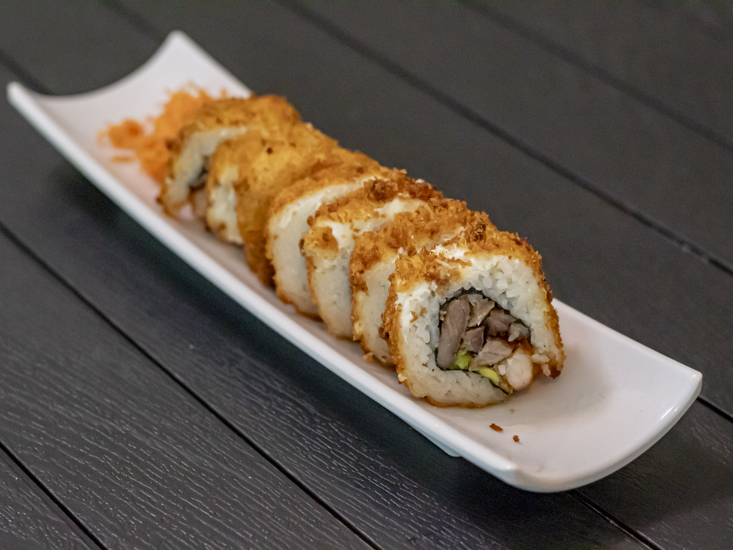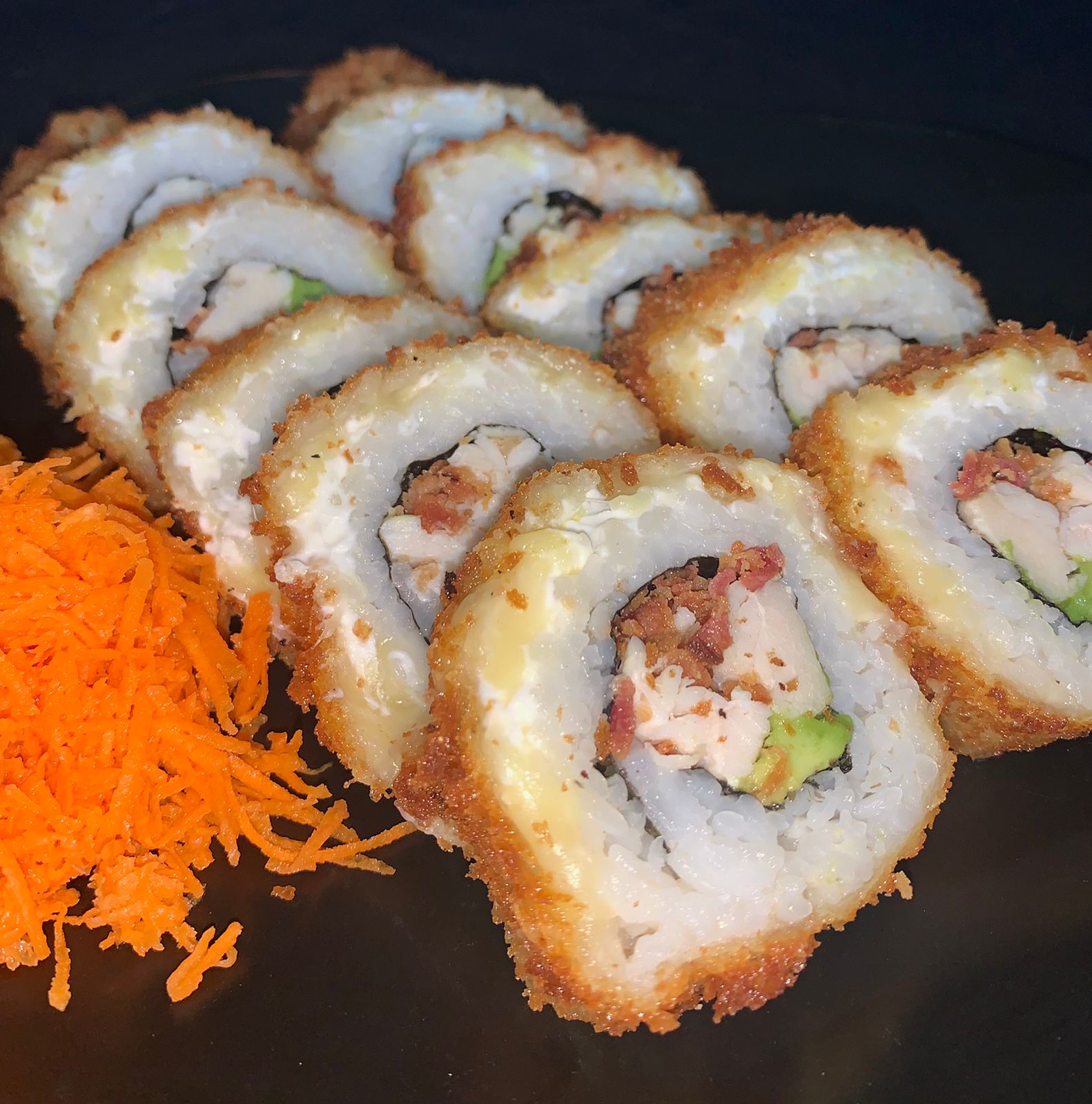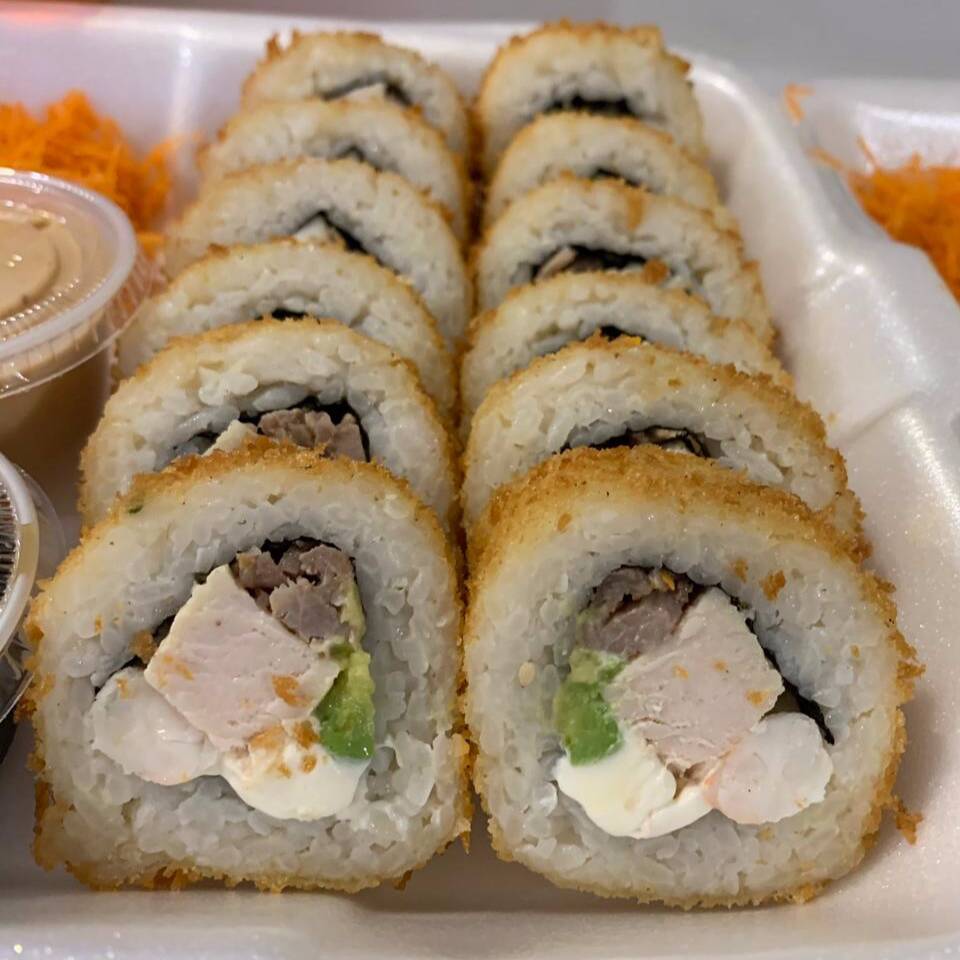 Rollo empanizado, por dentro aguacate, pepino y res, topping especial de camarón spicy, queso mozzarella y salsa de anguila.