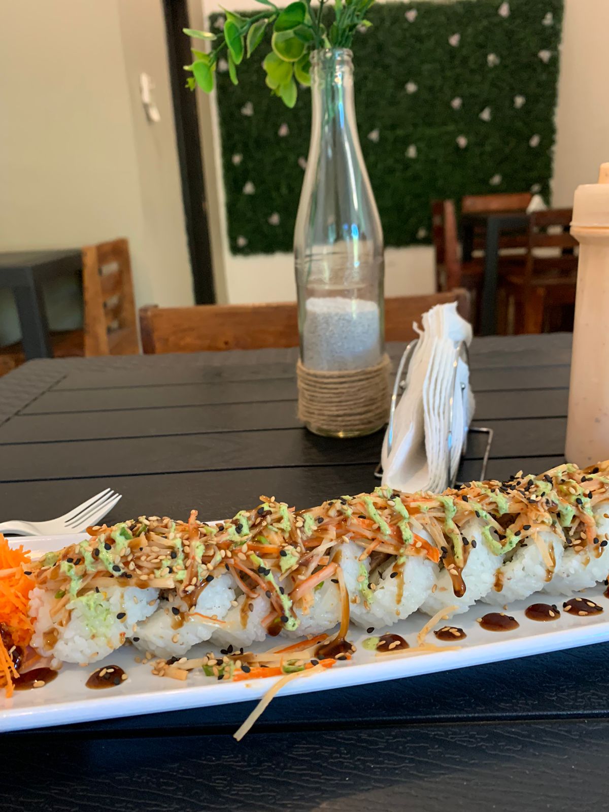 Por dentro philadelphia, pepino, aguacate y camarón, por fuera ajonjolí, topping de tampico especial, bañado en salsa de anguila, aderezo de cilantro y salsa siracha.