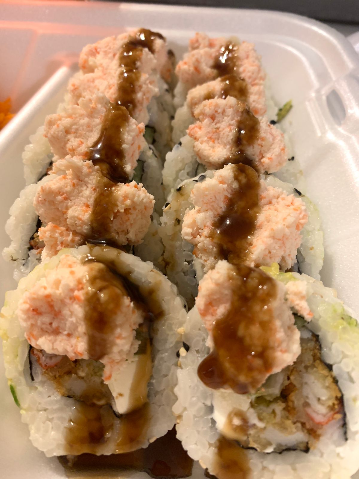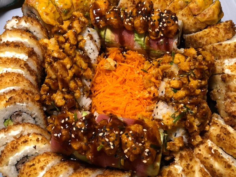 Por dentro philadelphia, aguacate, pepino y cangrejo empanizado, por fuera ajonjolí, topping de tampico y salsa de anguila.