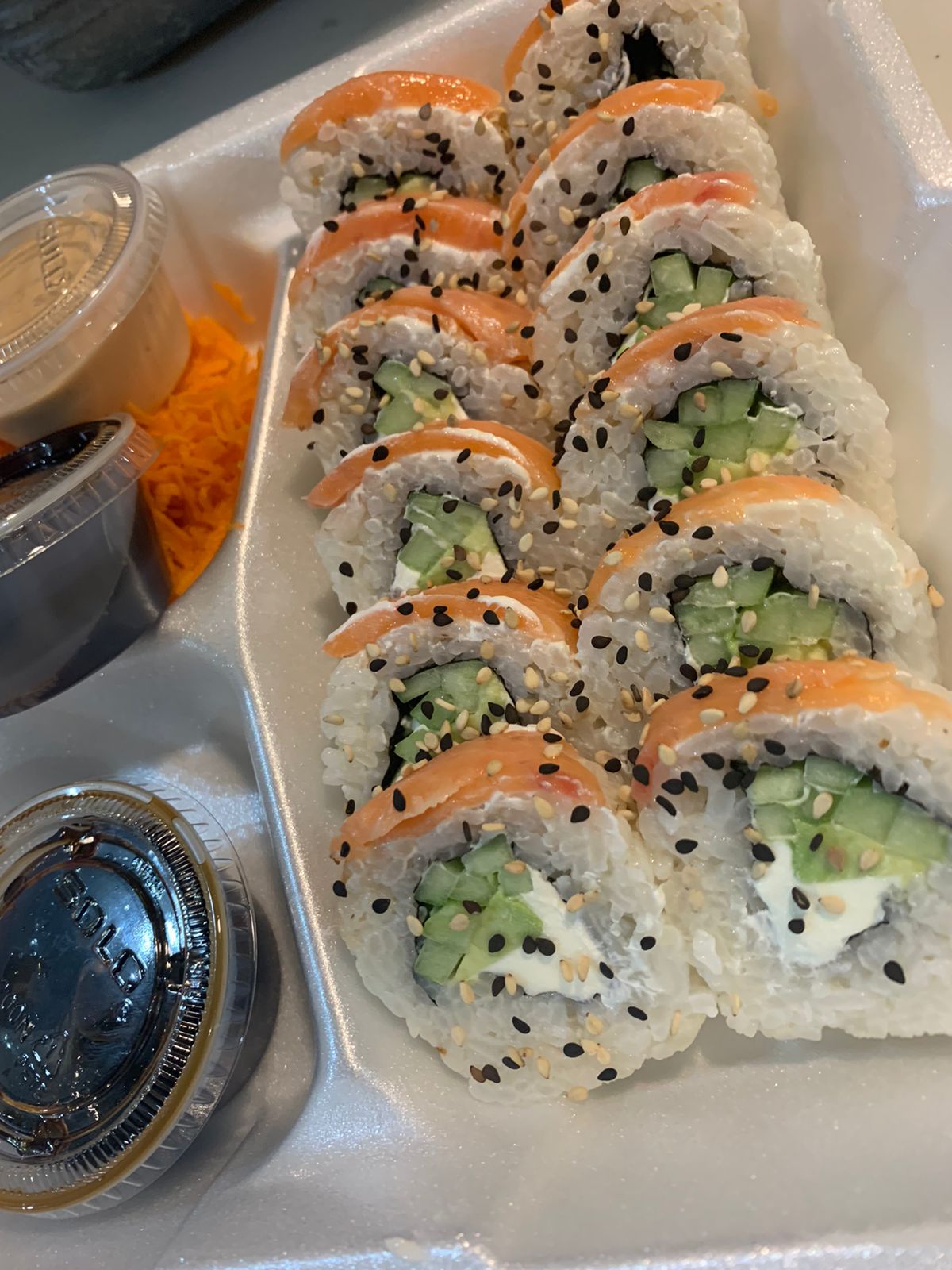 Por dentro philadelphia, aguacate, pepino y camarón, por fuera ajonjolí.