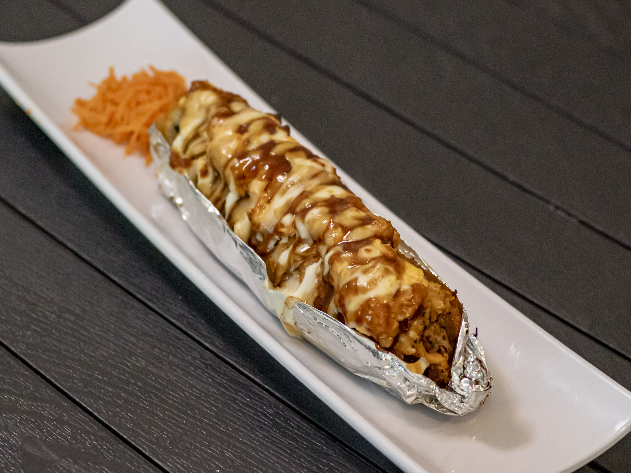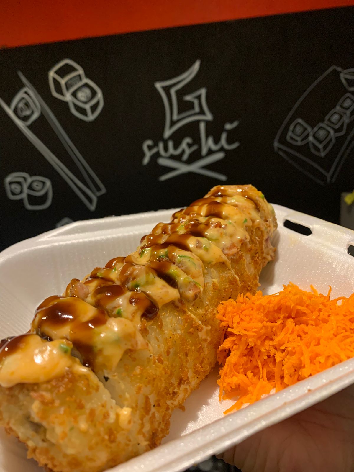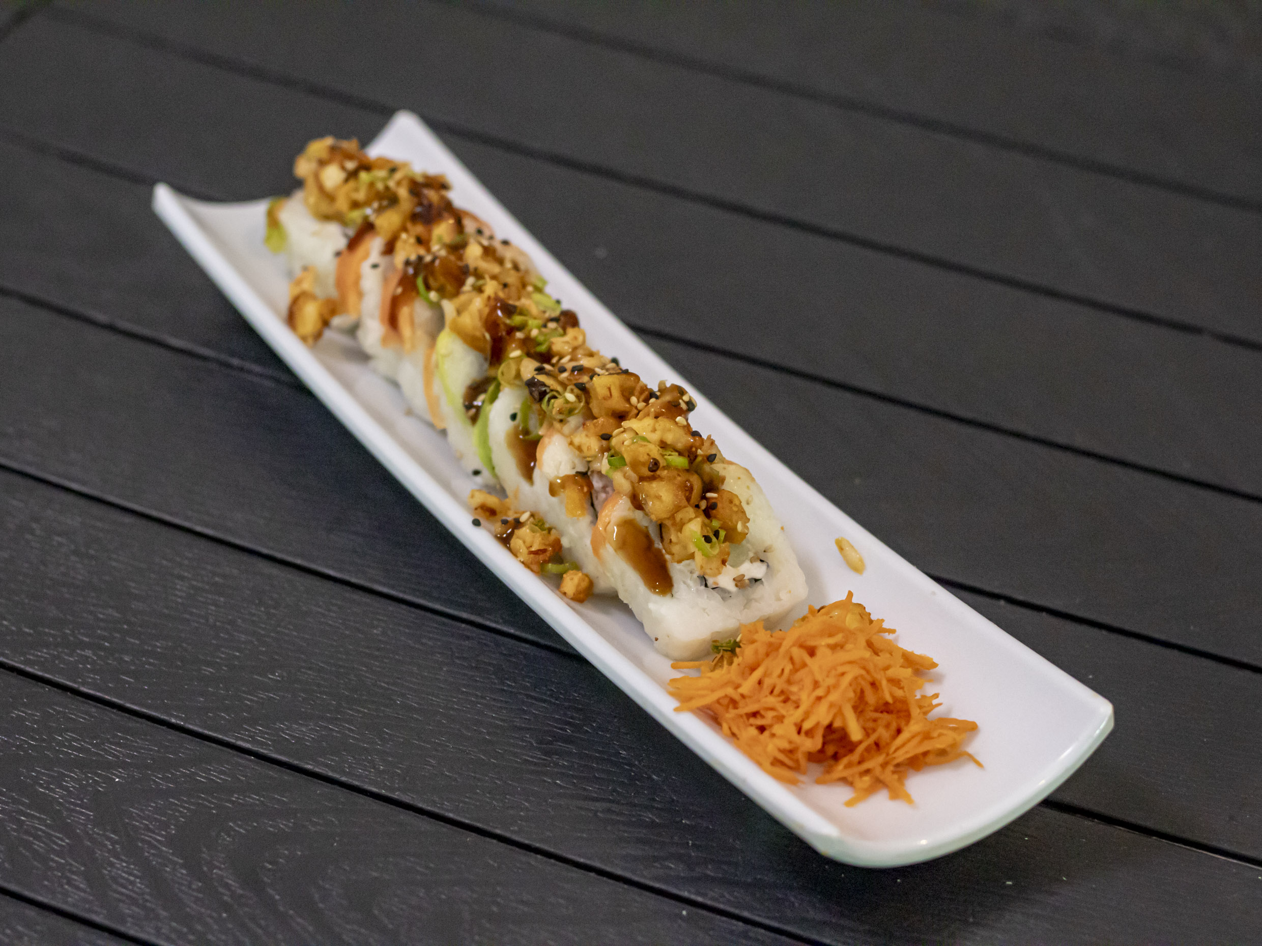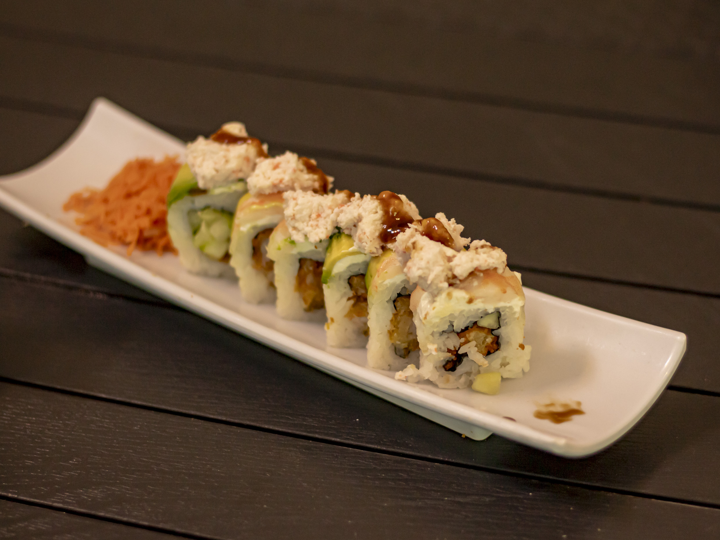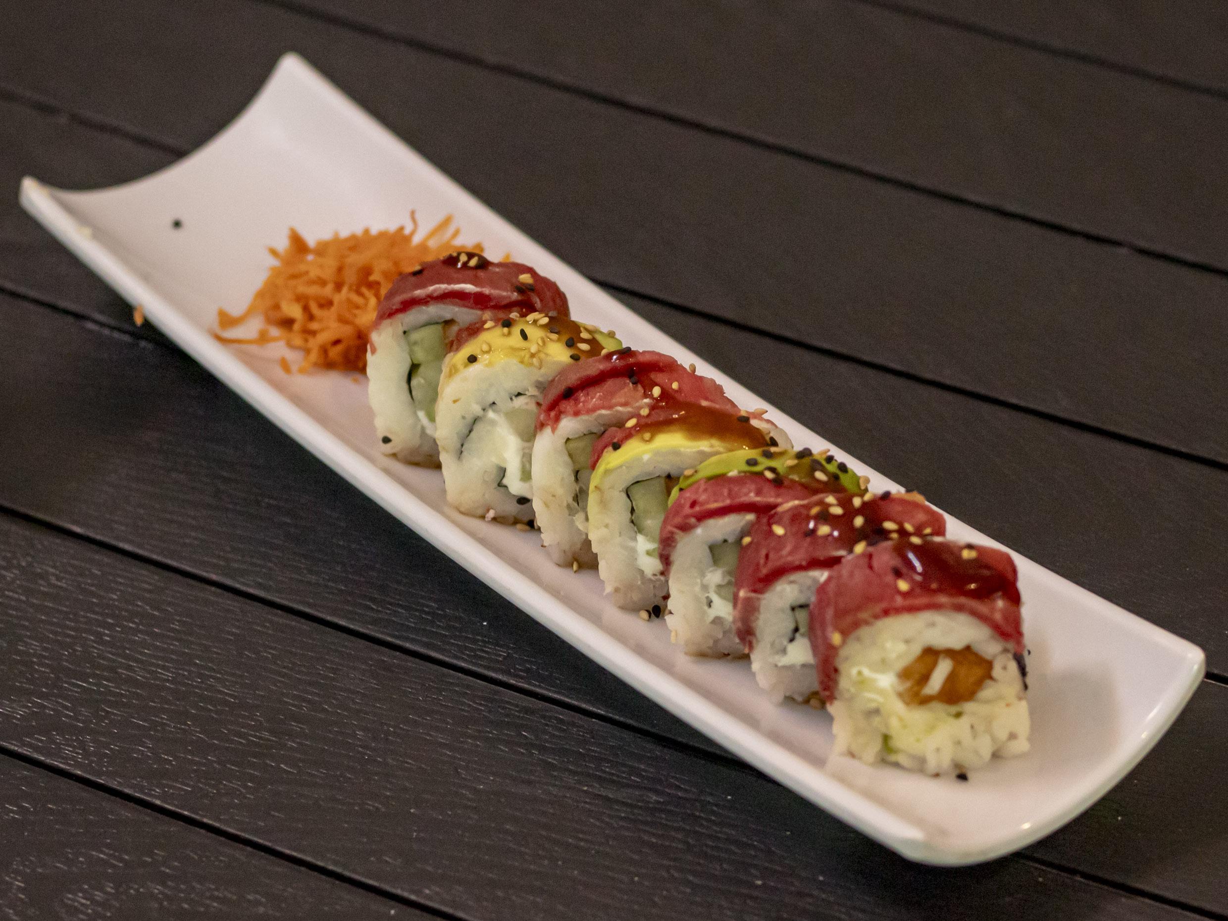 Por dentro philadelphia, pepino y tampico, por fuera proteína a escoger salmón o atún, topping spicy de camarón tempura, bañado en salsa de anguila y ajonjolí.
