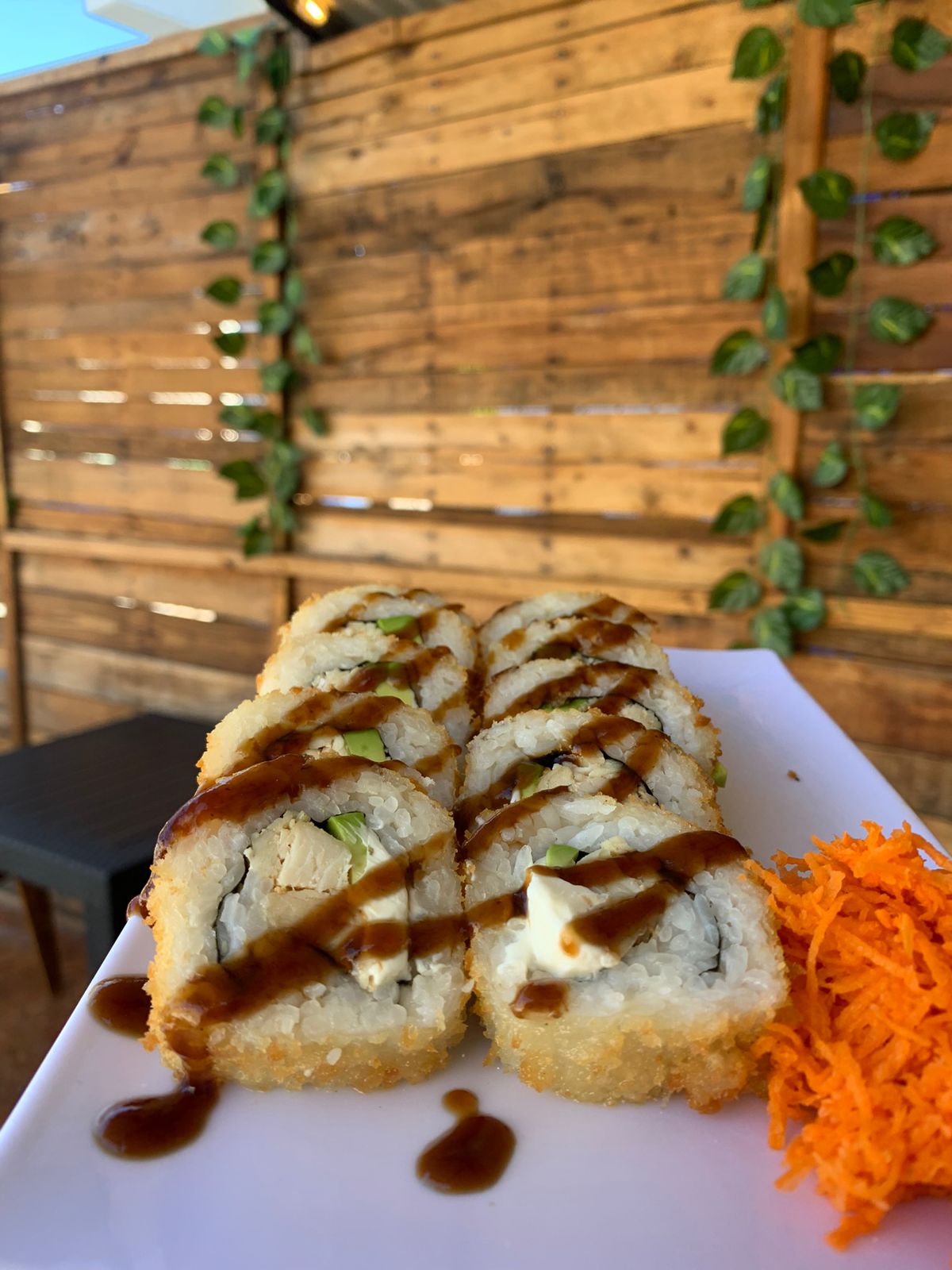 Por dentro philadelphia, aguacate y pepino, topping de tampico, pollo empanizado y salsa de anguila.