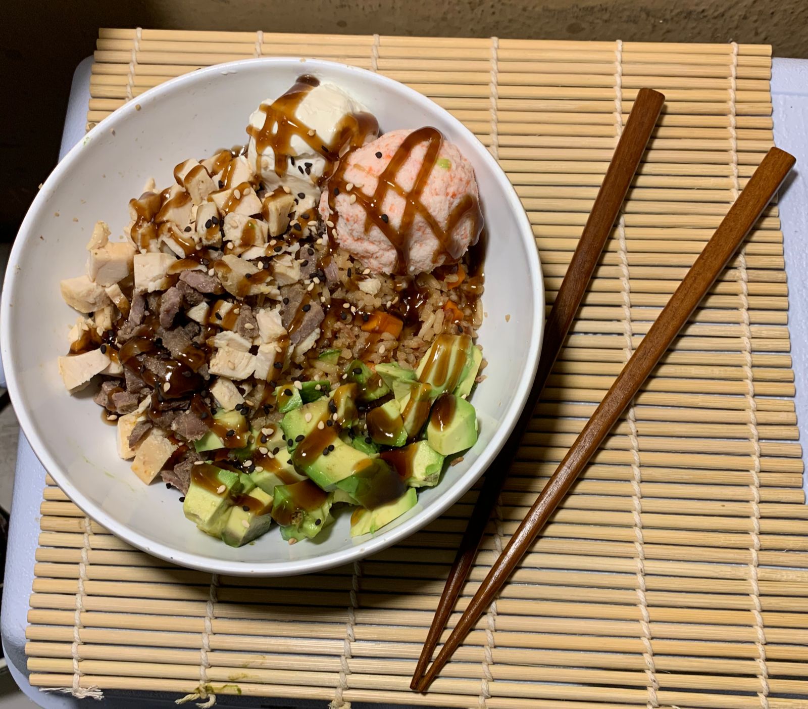 Base de arroz blanco, philadelphia, tampico, aguacate, res, pollo y camarón, bañado en salsa de anguila y furikake.