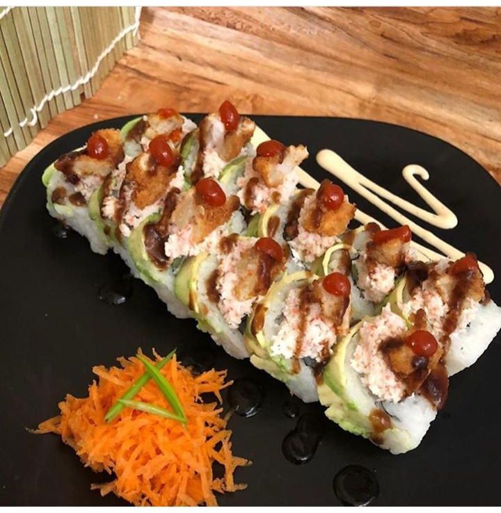 Por dentro aguacate, pepino, camarón empanizado, por fuera philadelphia, aguacate y camarón, topping de tampico y salsa de anguila.