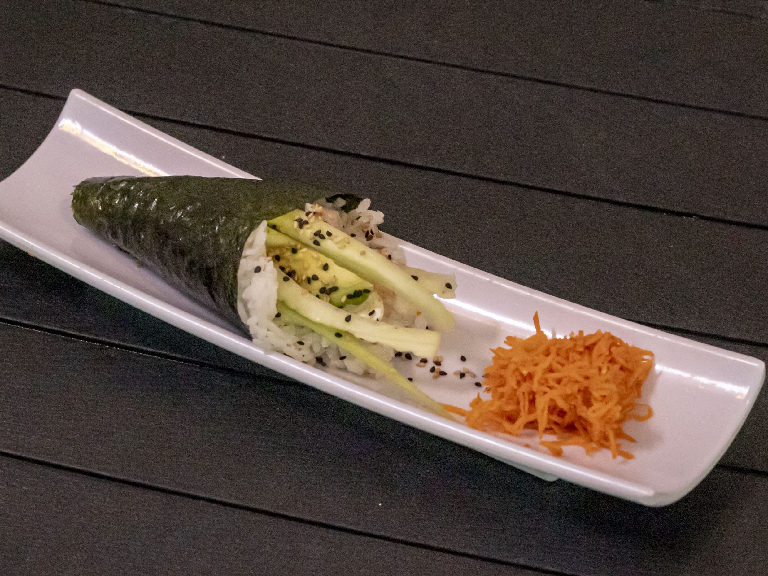Alga en forma de cono, por dentro philadelphia, pepino, aguacate, ajonjolí y proteína a elegir camarón, res, pollo, kanikama, tampico, salmón, atún.