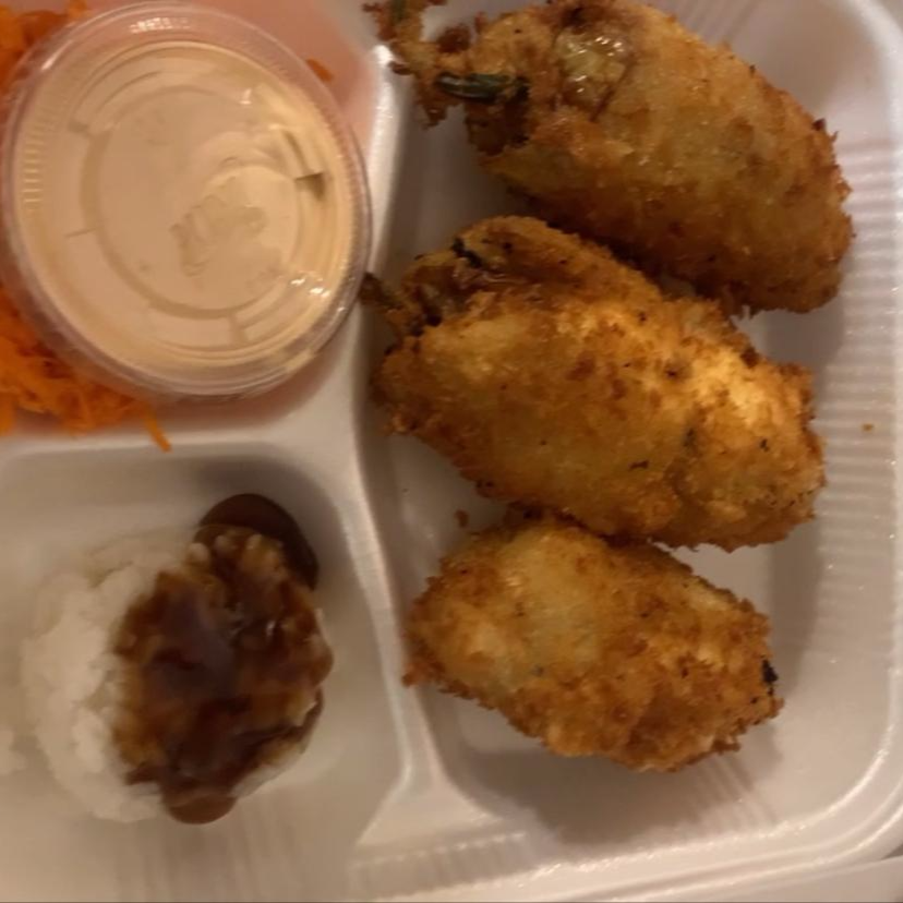 Tres piezas de chile caribe relleno de philadelphia con camarón.
