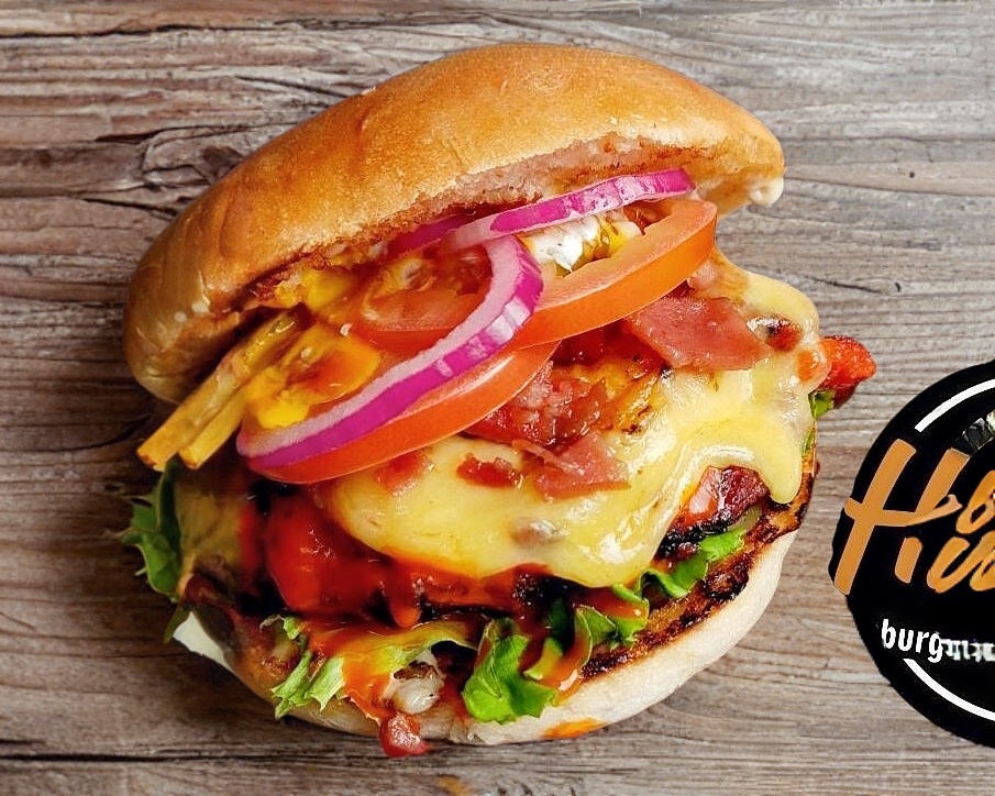 150 gramos de carne, tocino queso amarillo, piña asada, cebolla asada + bases y salsa de su eleccion