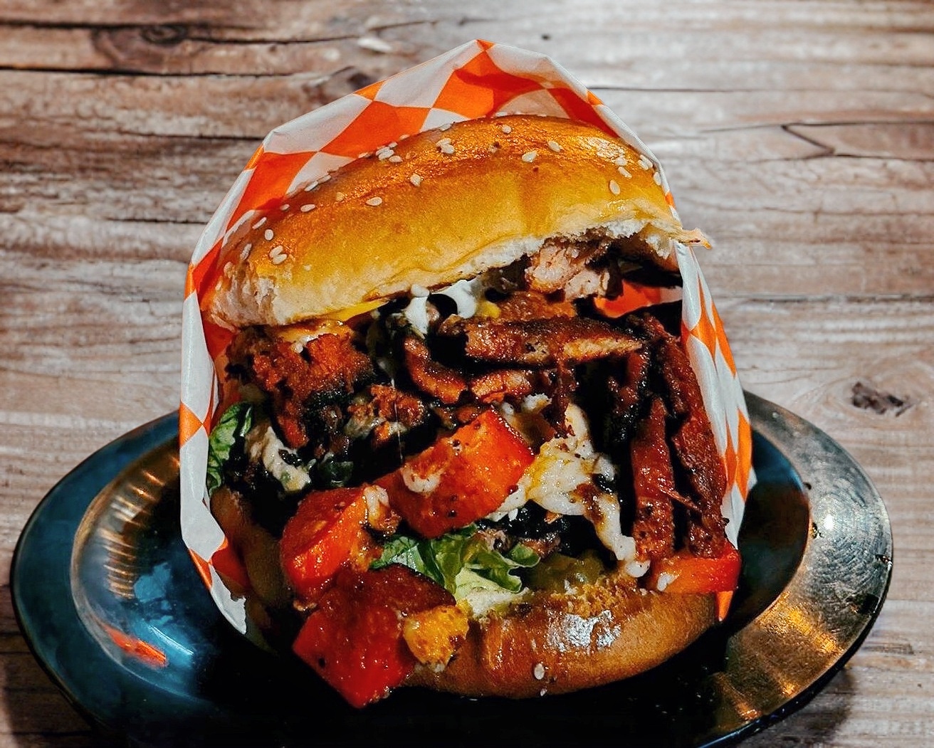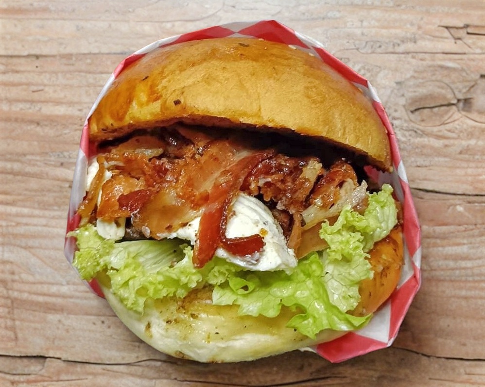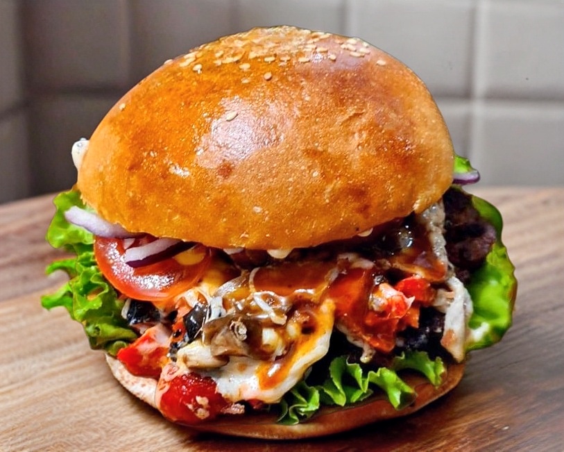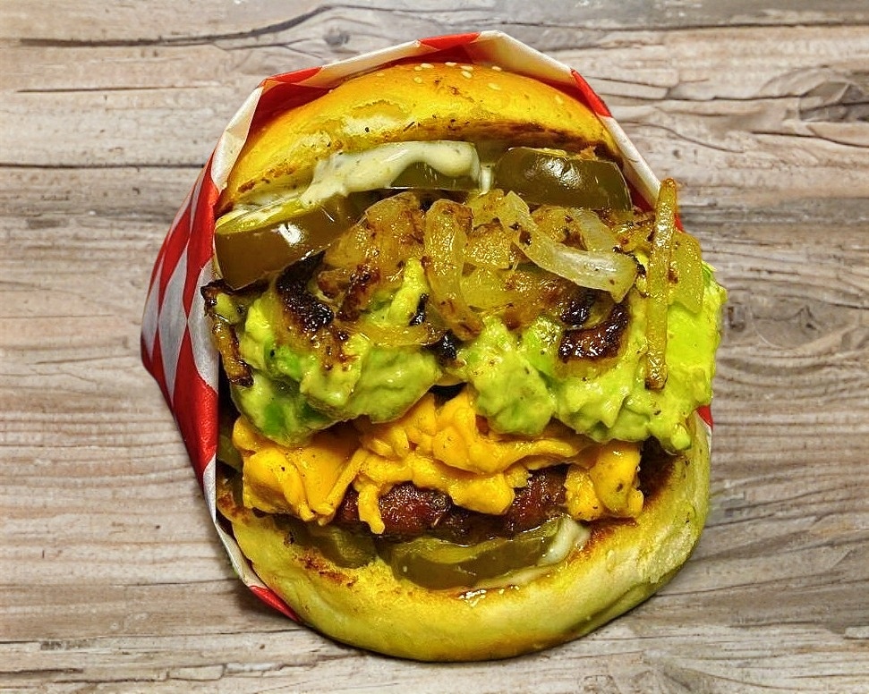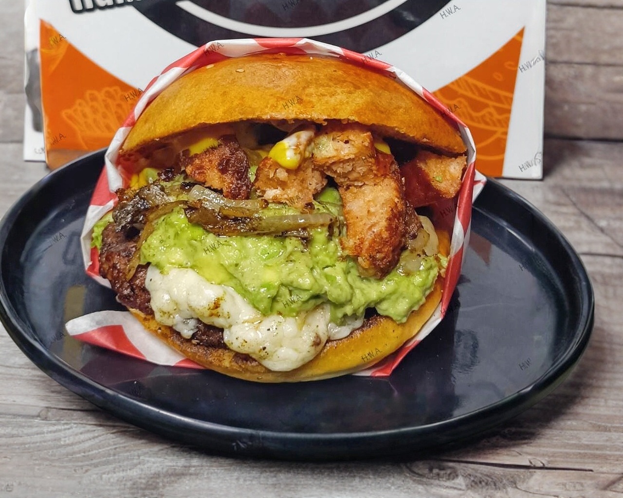 150 gramos de carne, queso de su elección, salchicha polaca, cebolla asada, pepinillos, guacamole + salsa de su eleccion