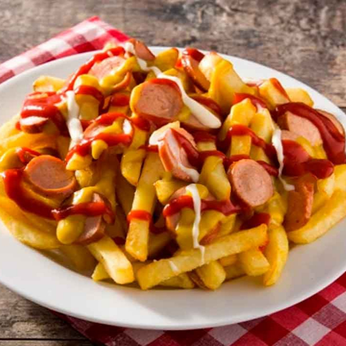 Papas fritas con salchicha parrillera en trozos.