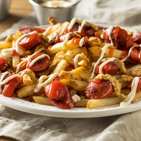 Trocitos de salchicha con papas a la francesa.