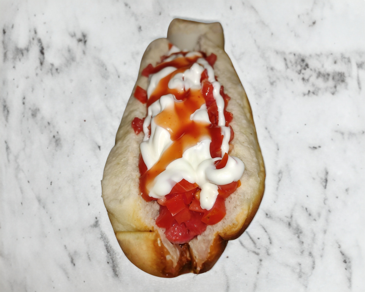 Salchicha logmont, cebolla, tomate, crema, salsa, catsup y mostaza.