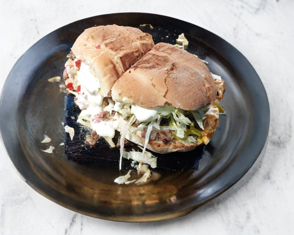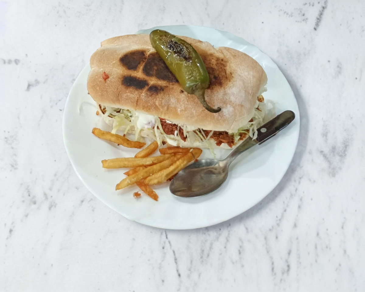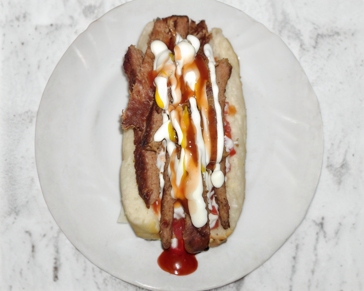 Carne asada o deshebrada, jamón, queso amarillo, salchicha y tocino, lechuga, tomate, cebolla, chile mostaza y crema (incluye un chilito toreado).
