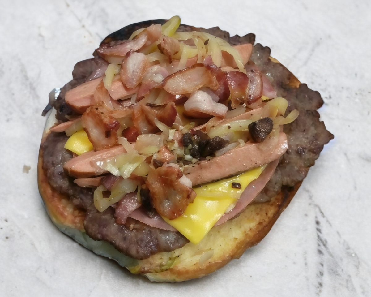 Doble carne, doble jamón, doble queso amarillo, queso chihuahua, salchicha, tocino, carne asada, carne deshebrada, lechuga, tomate, cebolla, salsa, crema catsup y mostaza. (incluye un chilito toreado)