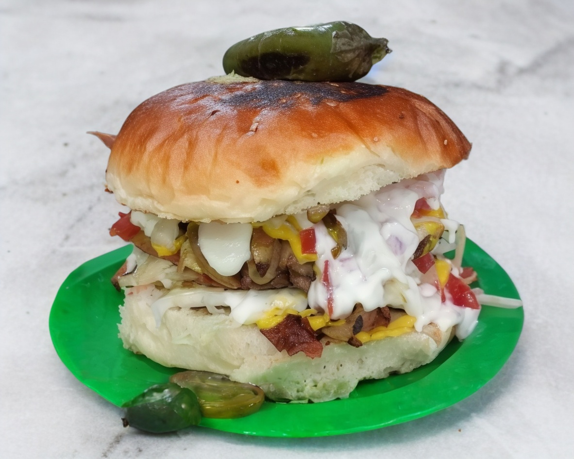 Carne molida de la mejor calidad, salchicha, tocino, jamón, queso amarillo, lechuga, tomate, cebolla, salsa, crema, catsup y mostaza. (incluye un chilito toreado)