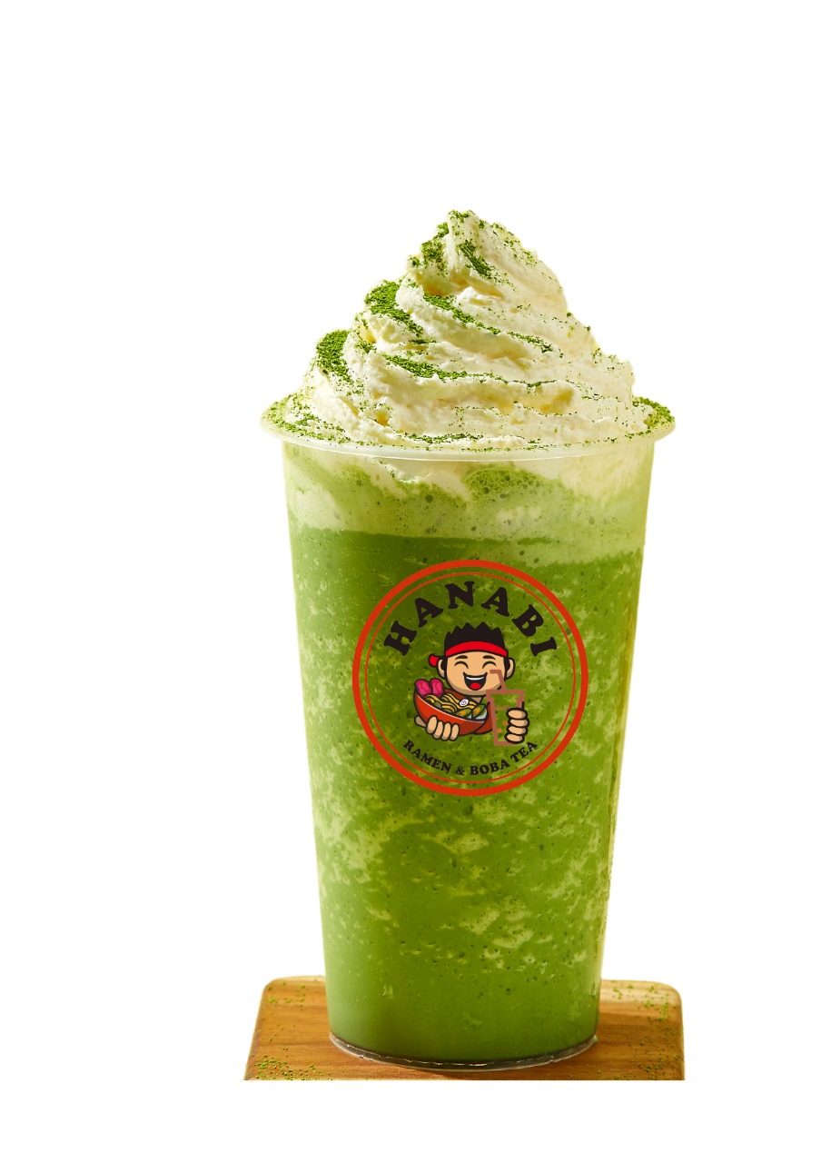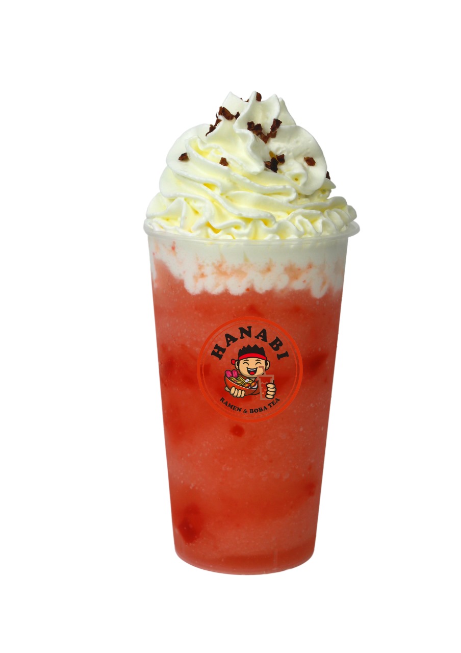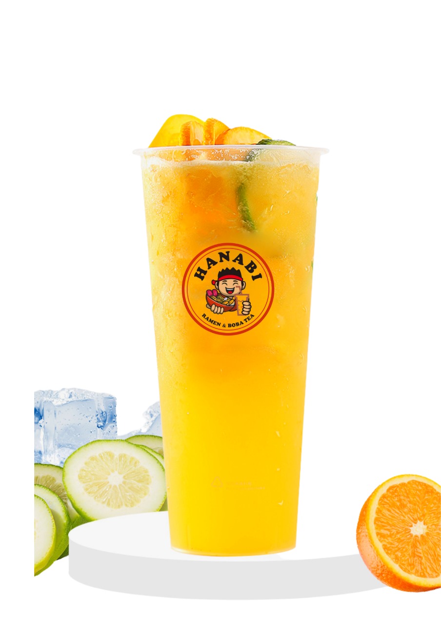 Bebida estilo frappé, elaborado con té y extracto de naranja, con topping de gelatina de té y cristal boba.