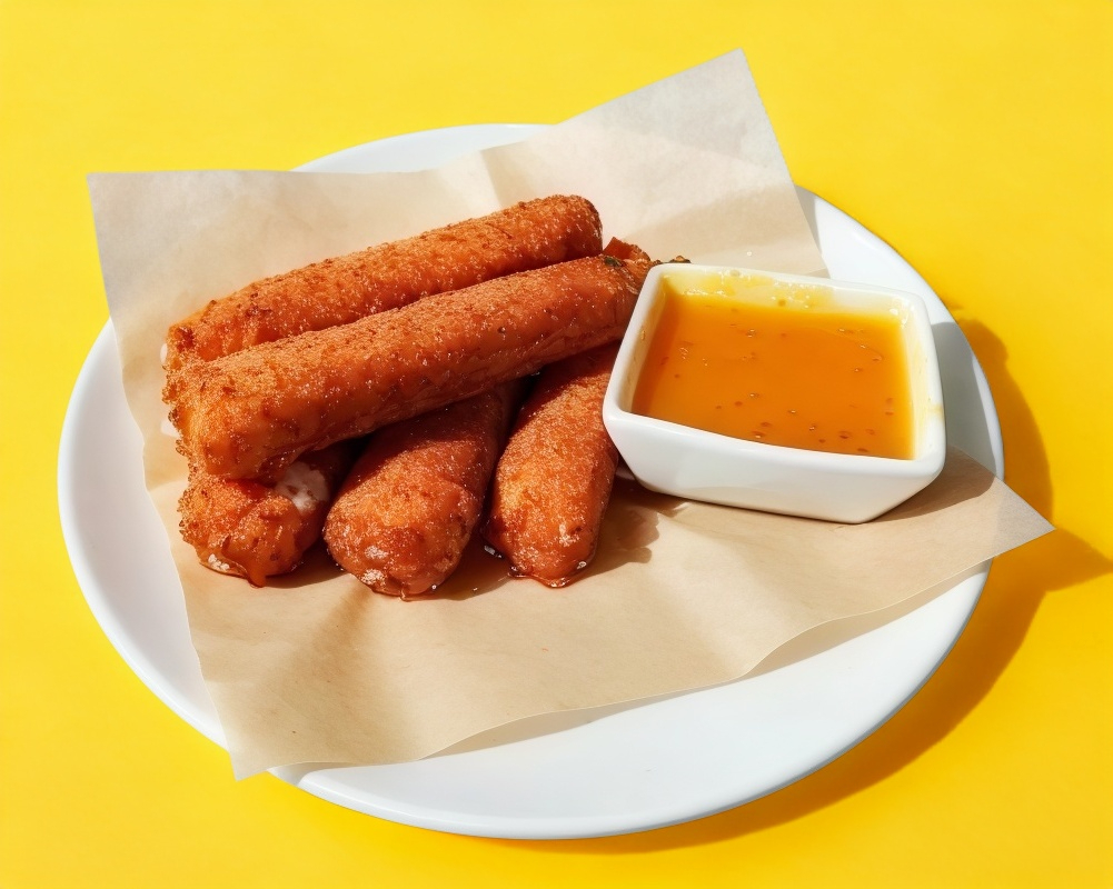 DEDOS DE QUESO CRUNCHYS HECHOS EN CASA DE AUTENTICO QUESO MOZZARELLA, INCLUYE 5 PIEZAS ACOMPAÑADOS DE UNA PORCIÓN DE SALSA MANGO HABANERO (2 ONZAS).