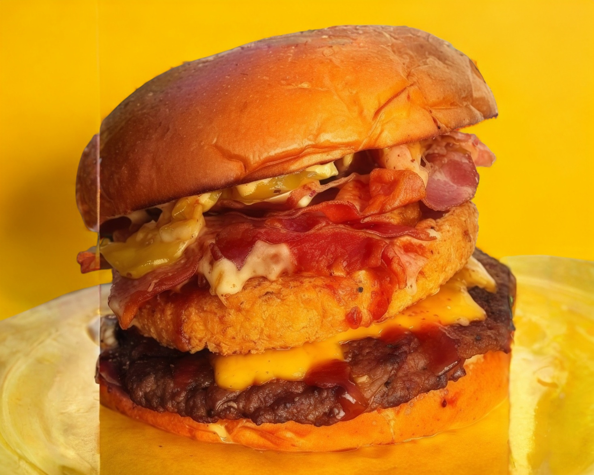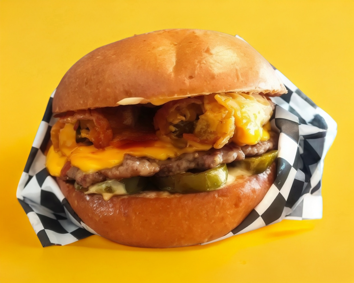 BOLLO BRIOCHE, SIRLOIN 145GR, TOCINO, QUESO CHEDDAR BASE DE CHILES JALAPEÑOS 3 PIEZAS DE JALAPEÑO POPPER, SALSA BÚFALO Y PEPINILLOS.