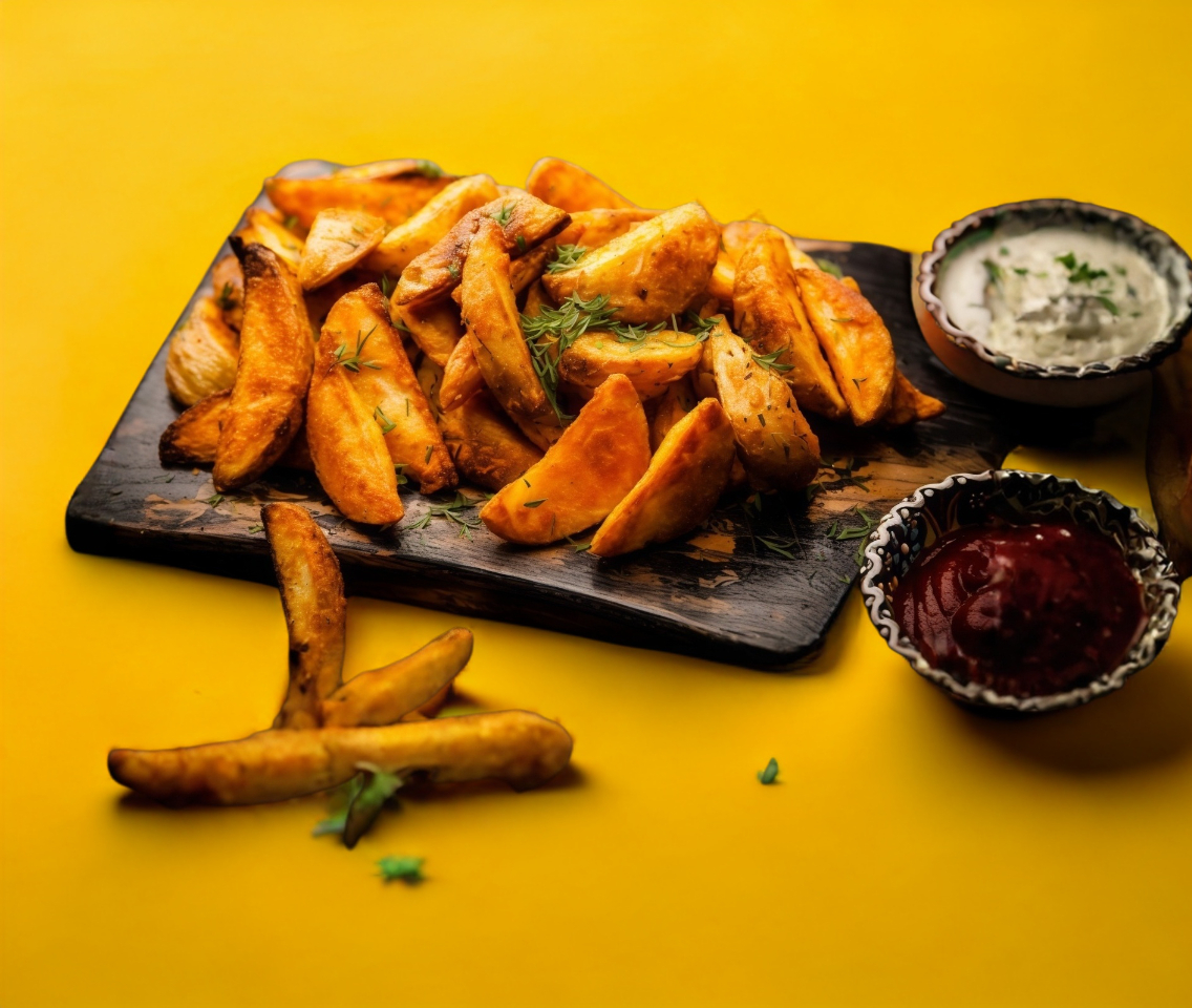 RICAS PAPAS GAJO SAZONADAS ( 400 GRAMOS), ACOMPAÑADAS CON UNA PORCIÓN DE SALSA CATSUP Y ADEREZO DE QUESO CHEDDAR.