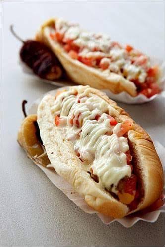 Salchicha logmont, envuelta en tocino,tomate,cebolla(asada o cruda),crema,catsup,chile, mostaza,carne asada,aguacate,queso amarillo