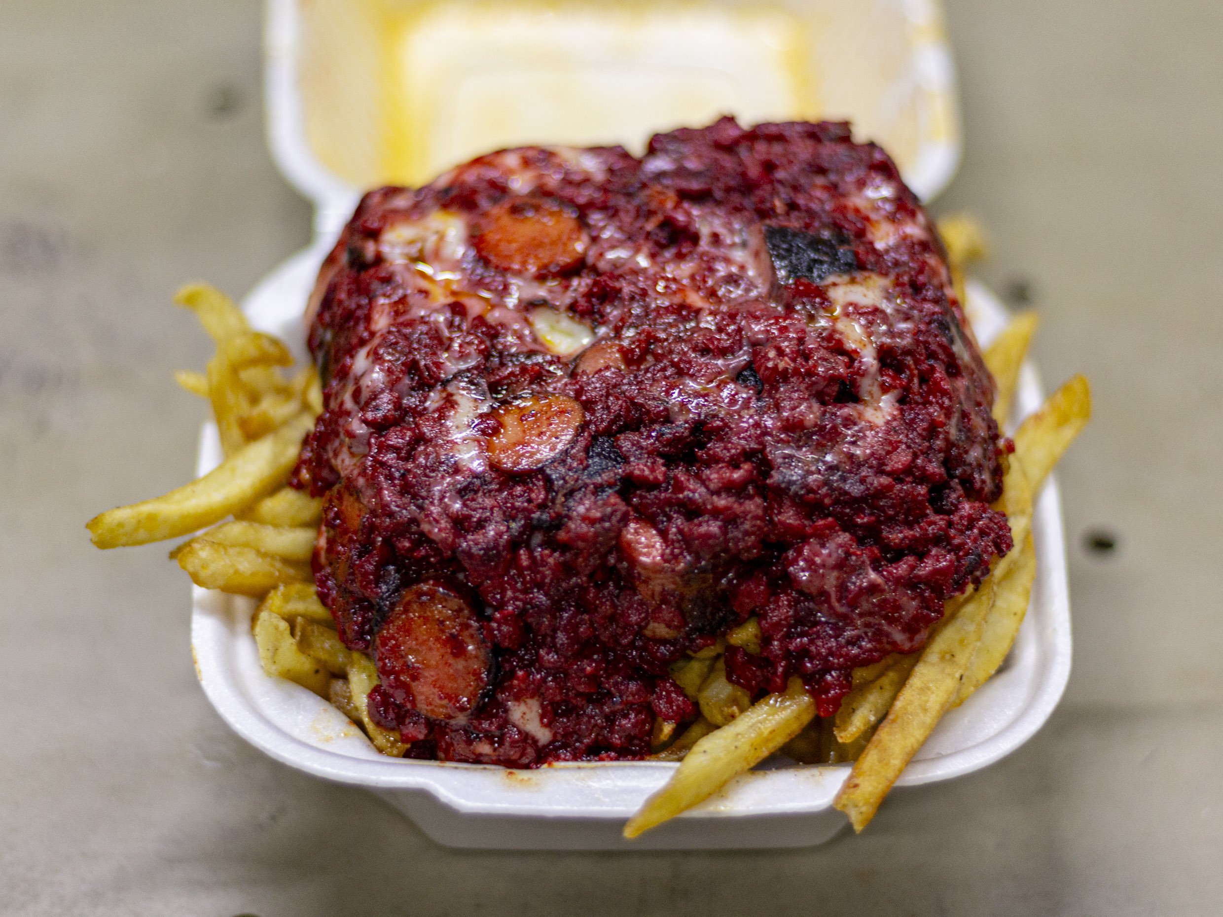 Órden de papas, carne de cochinita pibil, 2 salchichas logmo, queso mozarella y aderezos