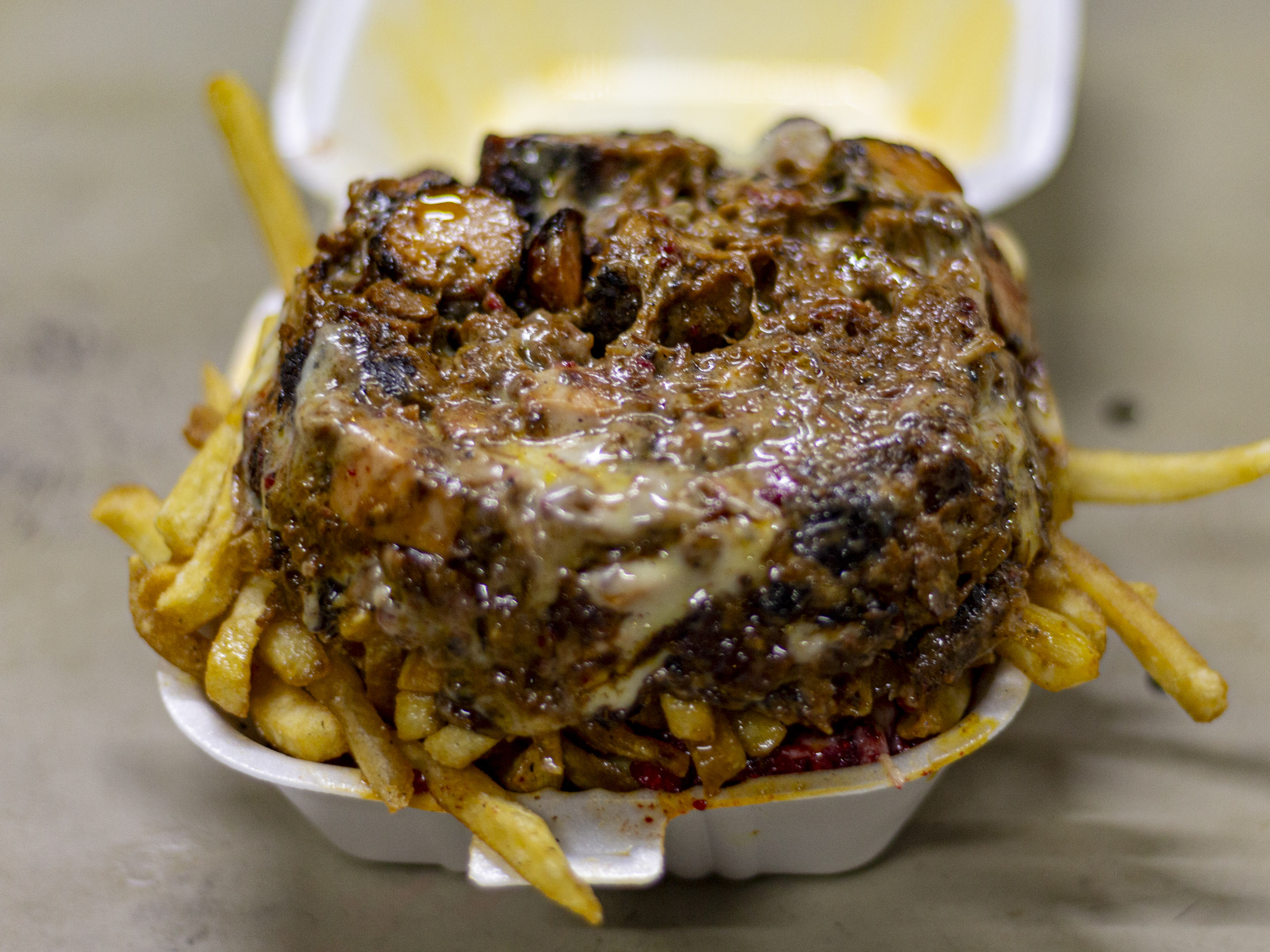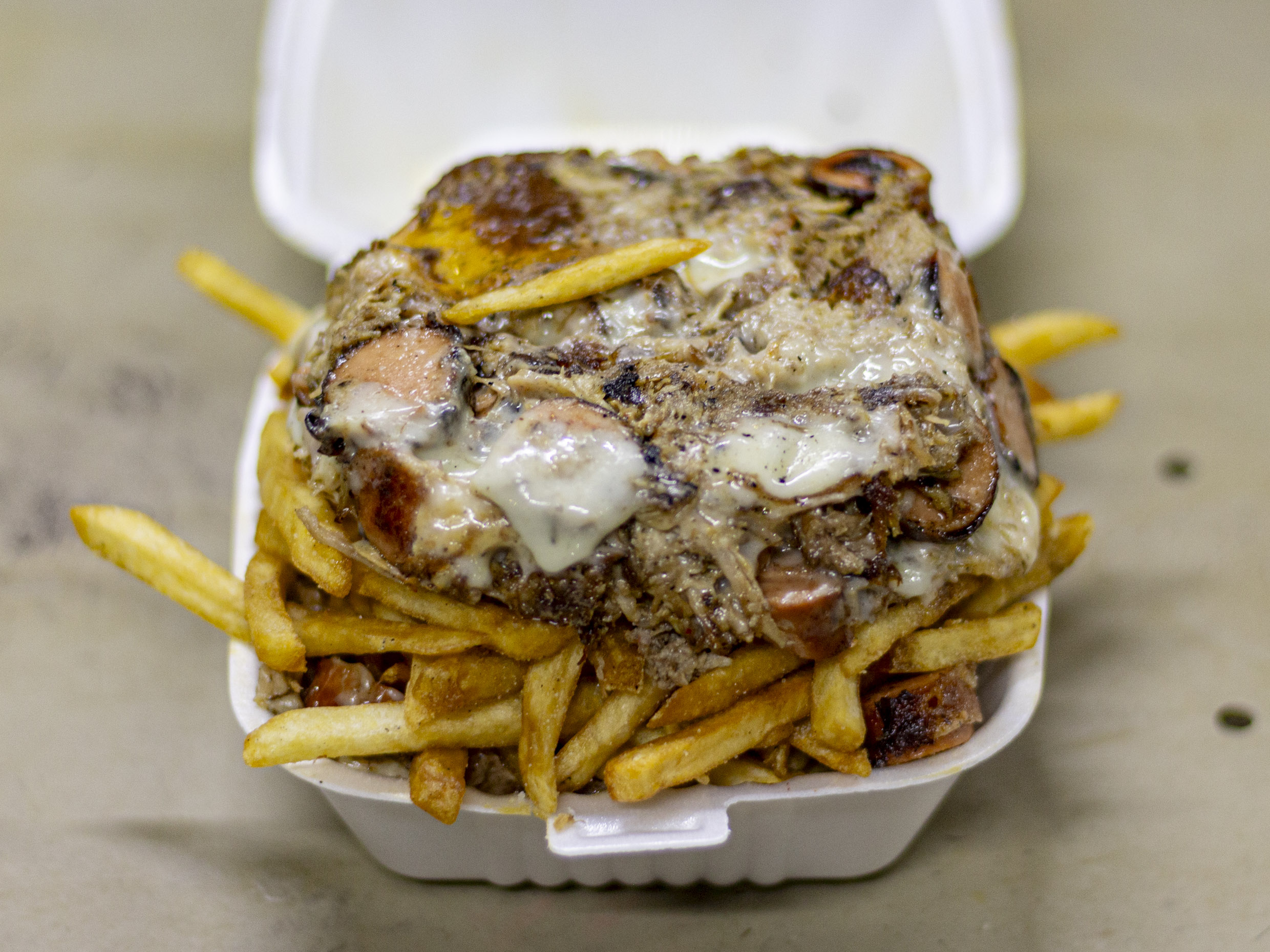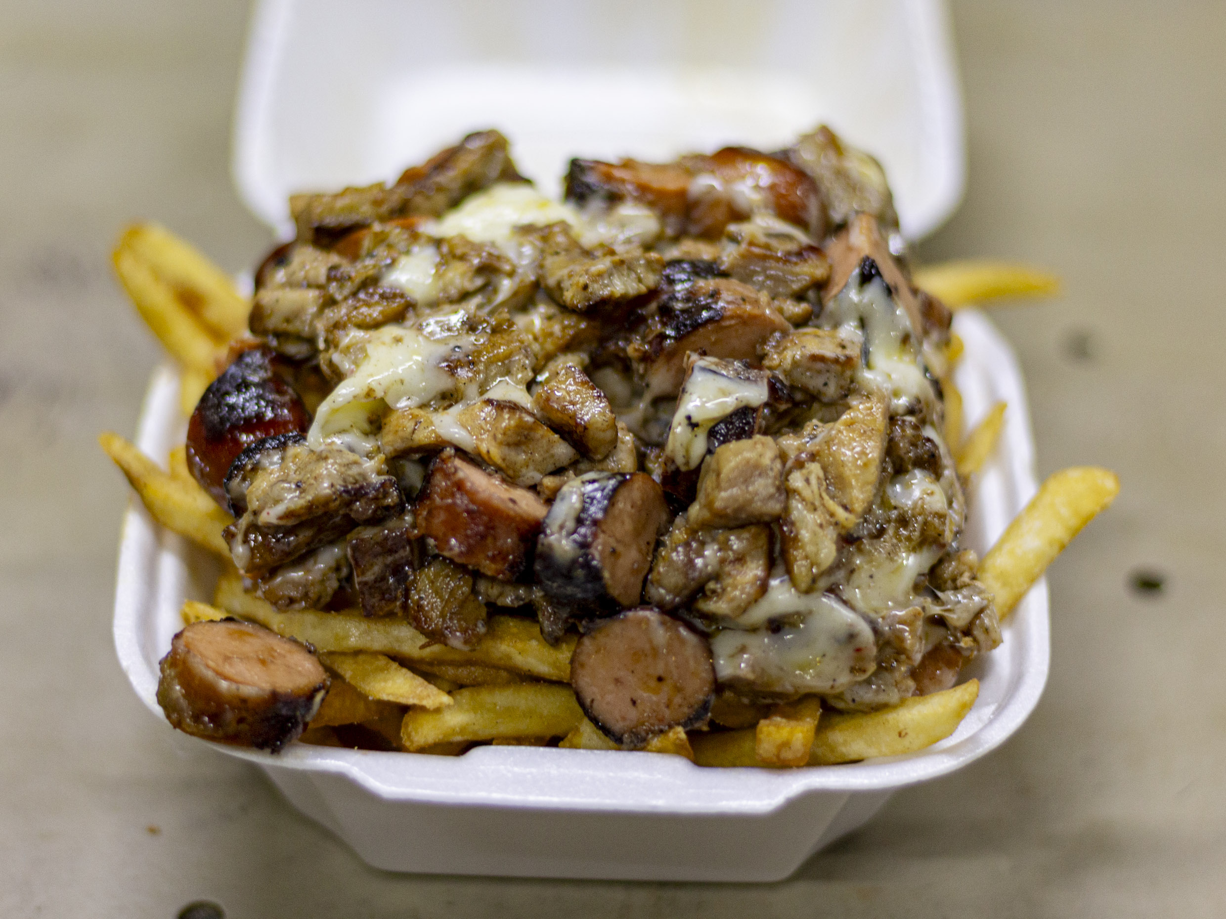 Orden de papas, carne deshebrada, 2 salchichas movió, queso mozarella y aderezos