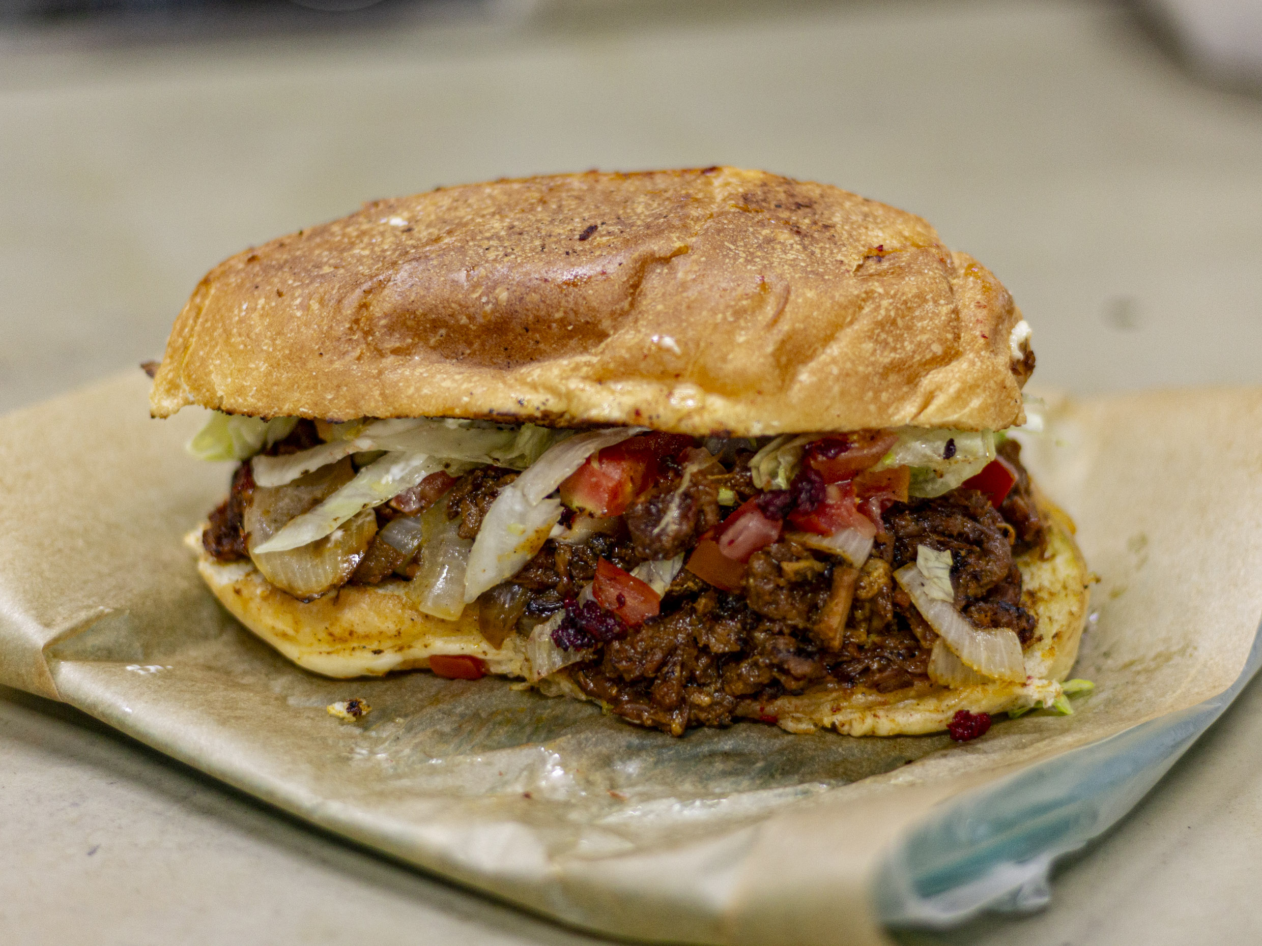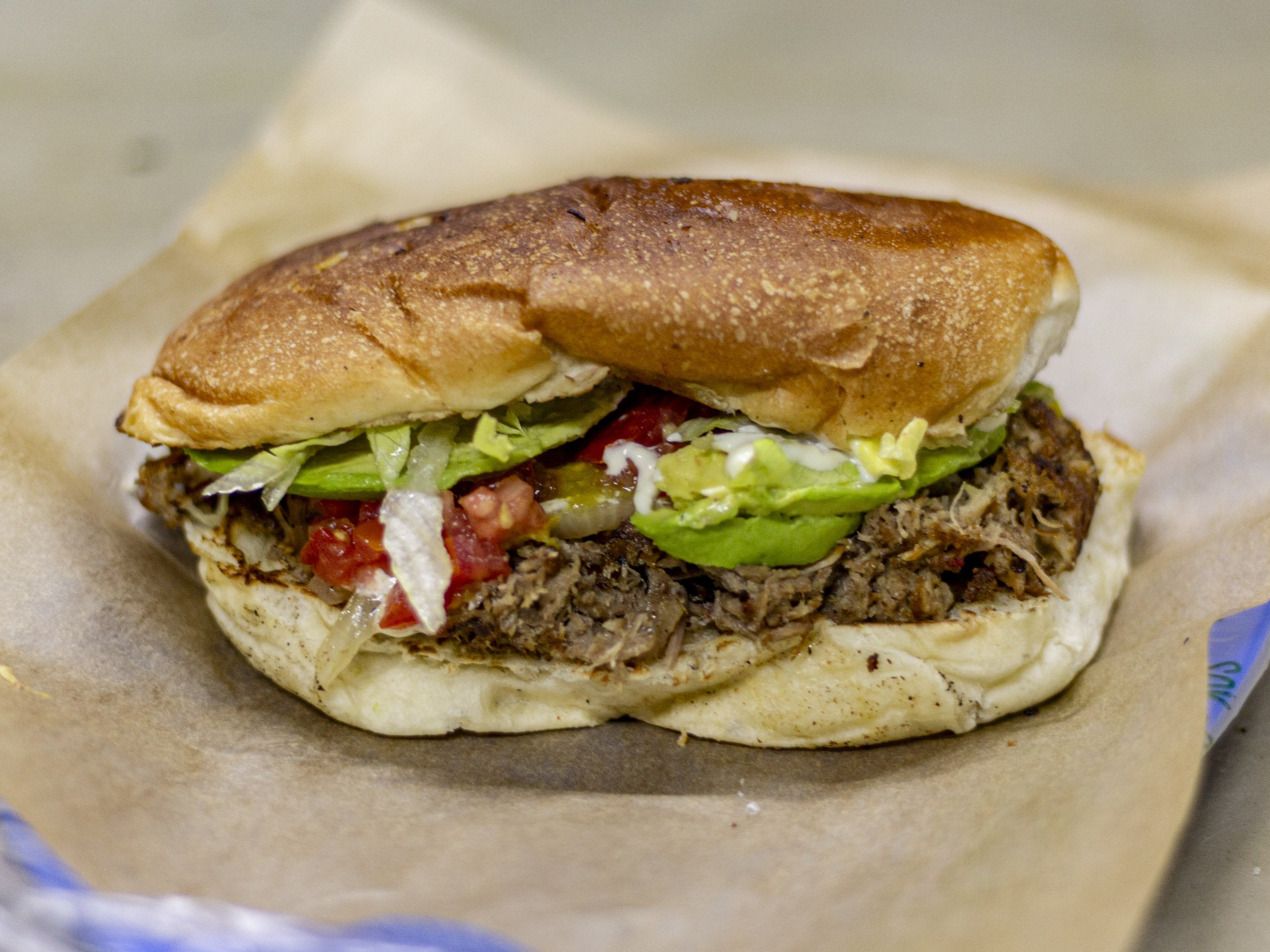 Carne deshebrada, tomate, cebolla, crema, catsup, chile, mostaza, lechuga, aguacate