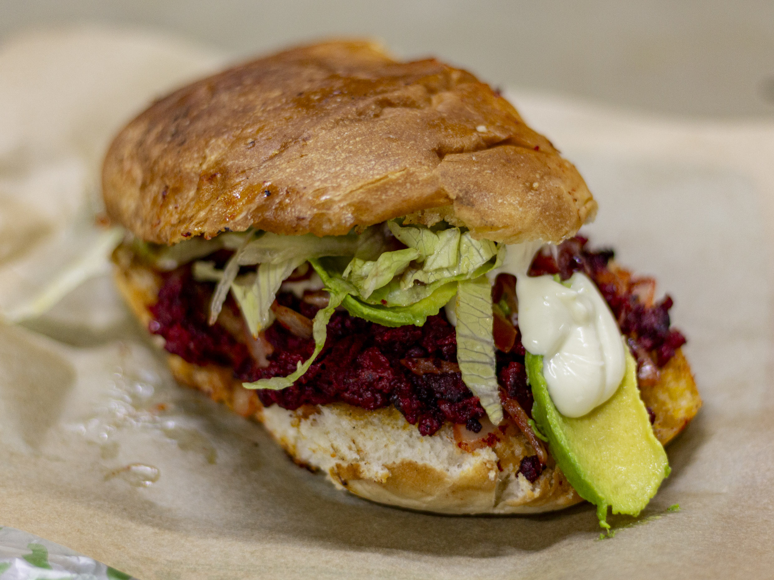 Hamburguesa con pechuga empanizada,tomate,lechuga,aguacate,cebolla y aderezos.