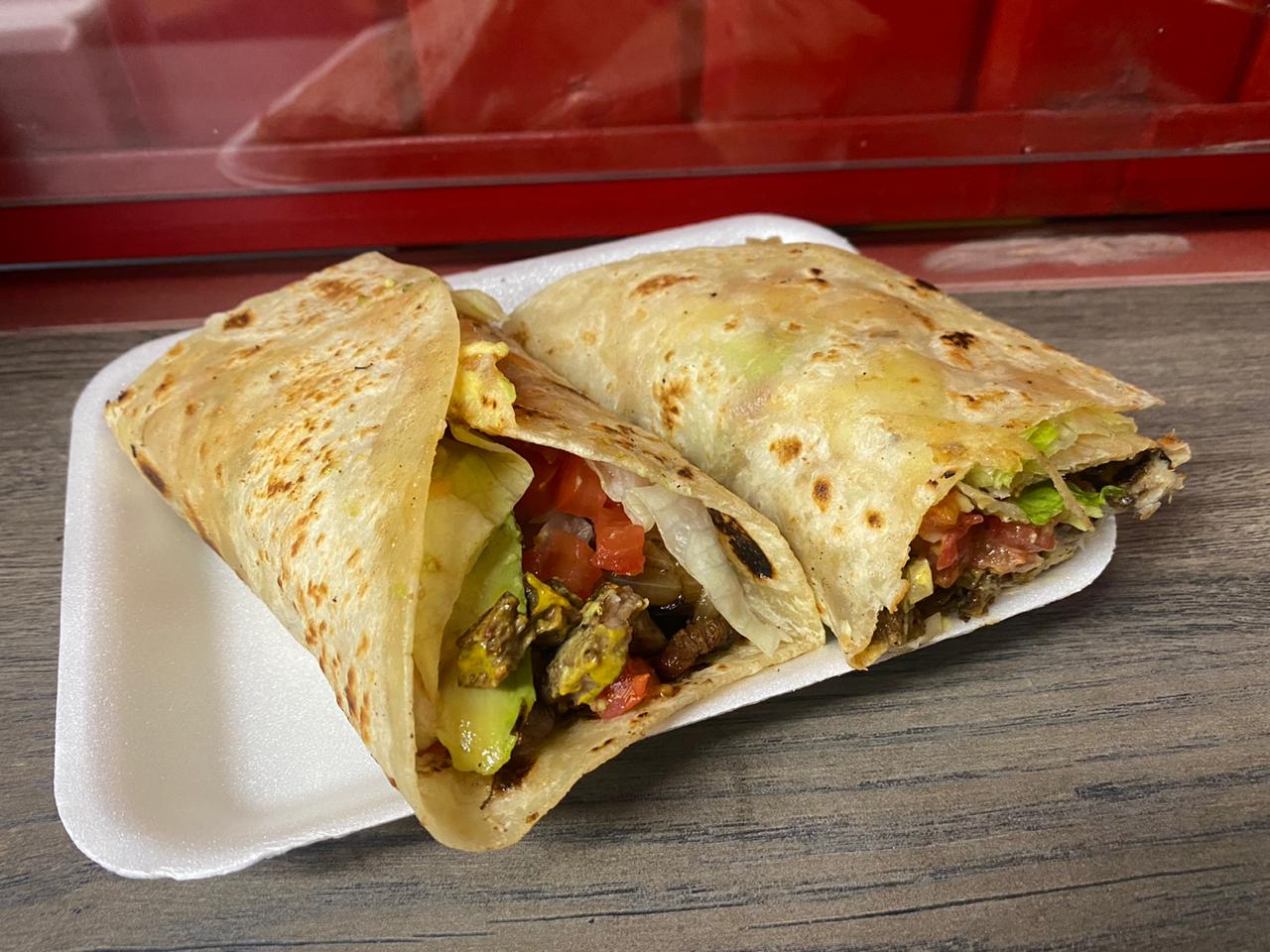 Carne asada, tomate, cebolla, crema, catsup, chile, mostaza, lechuga, aguacate