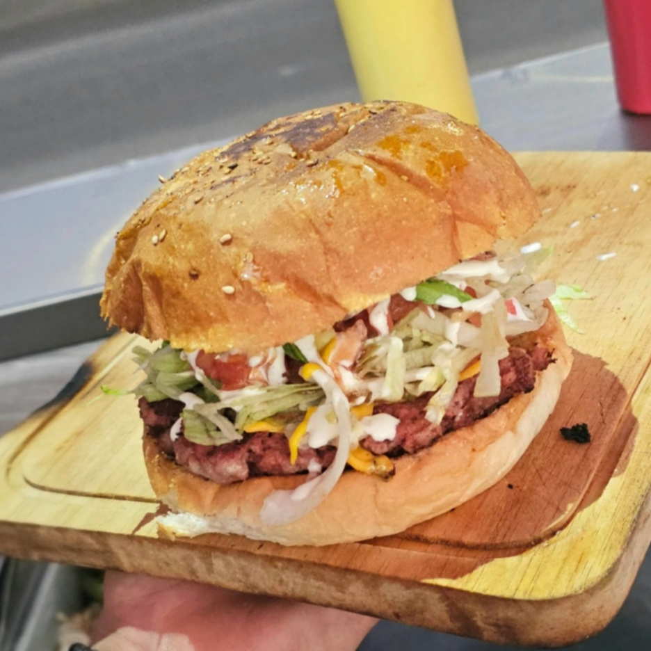 Deliciosa hamburguesa: carne de excelente calidad, jamón, queso amarillo, lechuga, tomate, cebolla asada, aguacate, mostaza, crema y kétchup.