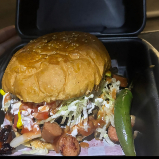 Deliciosa hamburguesa: carne de excelente calidad, jamón, salchicha Longmont, tocino, queso amarillo, lechuga, tomate, cebolla asada, aguacate, mostaza, crema y kétchup.