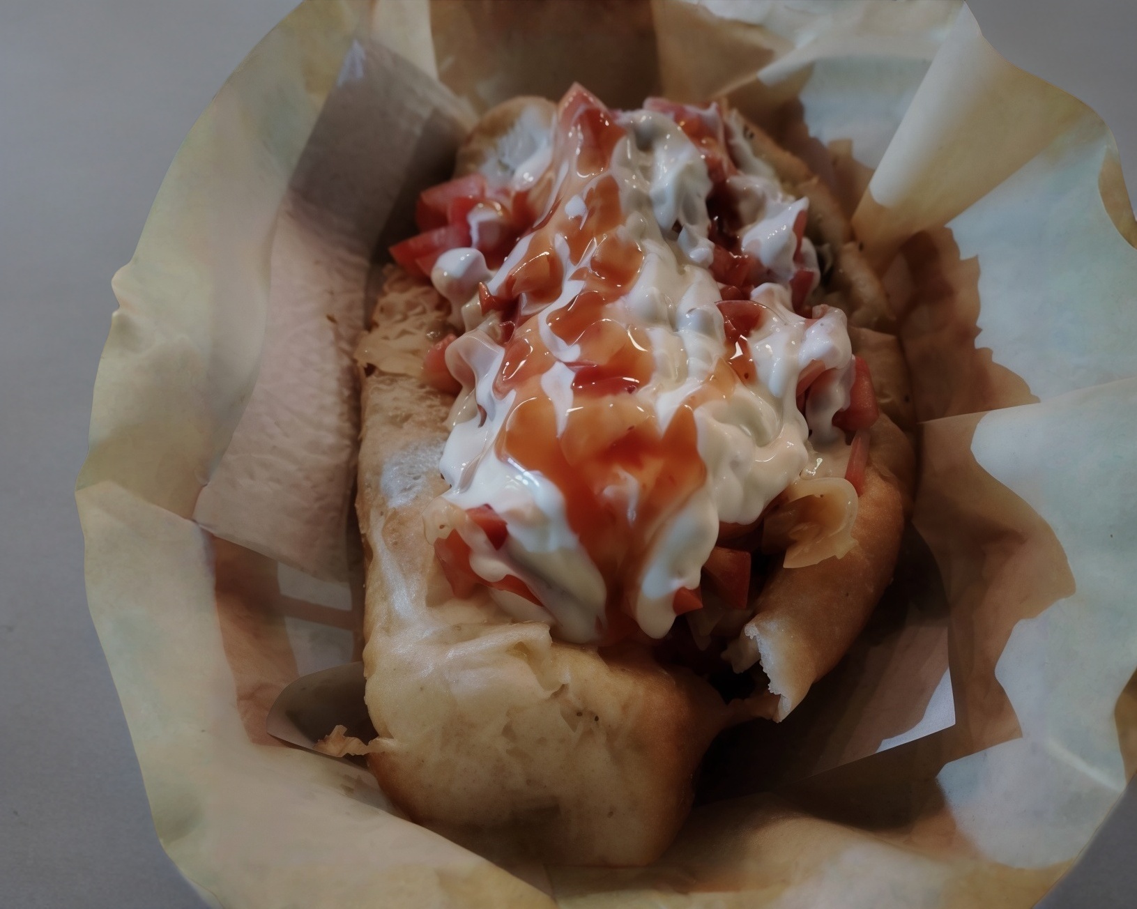 carne deshebrada, queso gouda, salchicha, cebolla asada o cebolla cruda, tomate, mostaza, crema y catsup