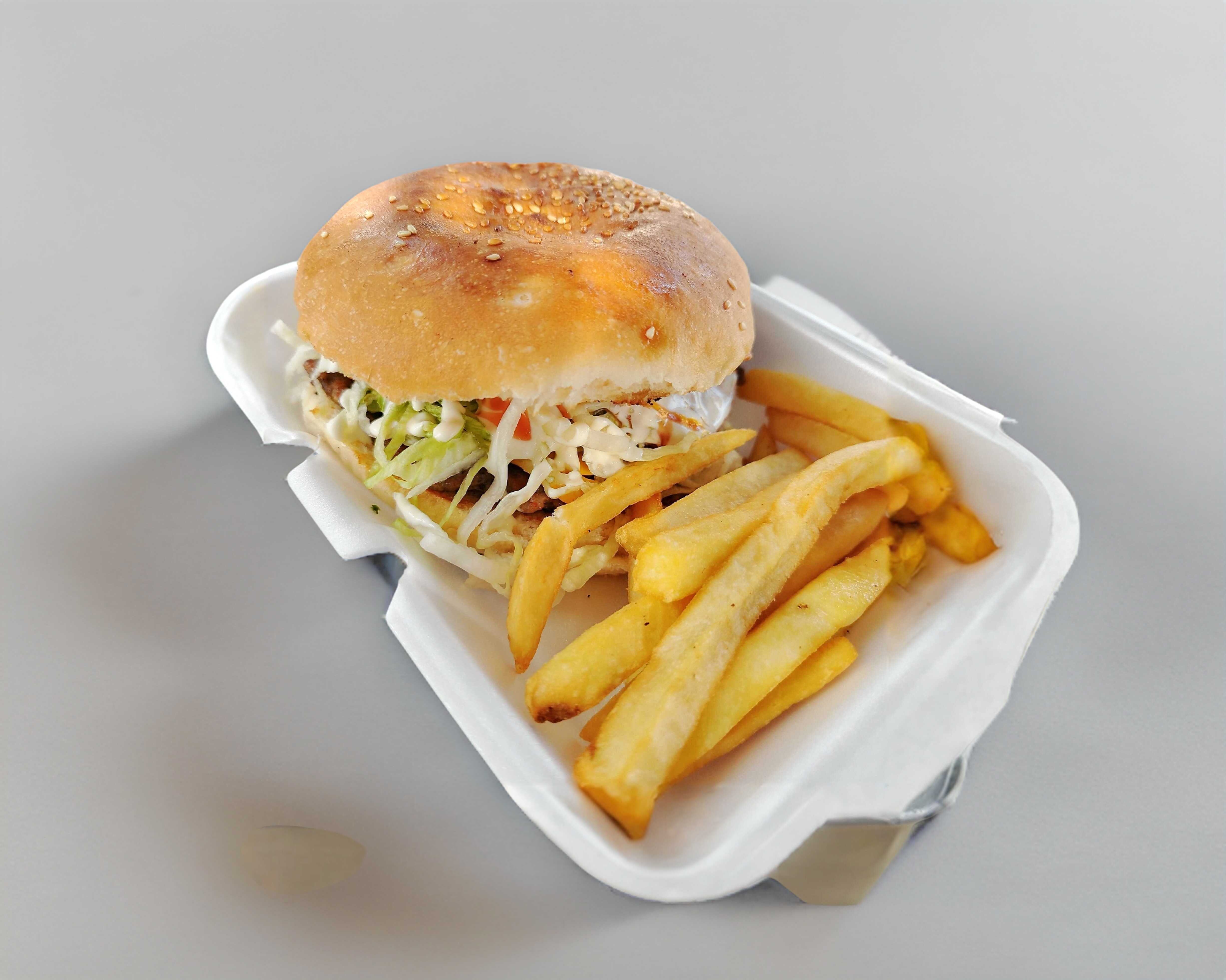 hamburguesa con papas fritas, cebolla asada, tomate, lechuga, aguacate, crema, mostaza y catsup.