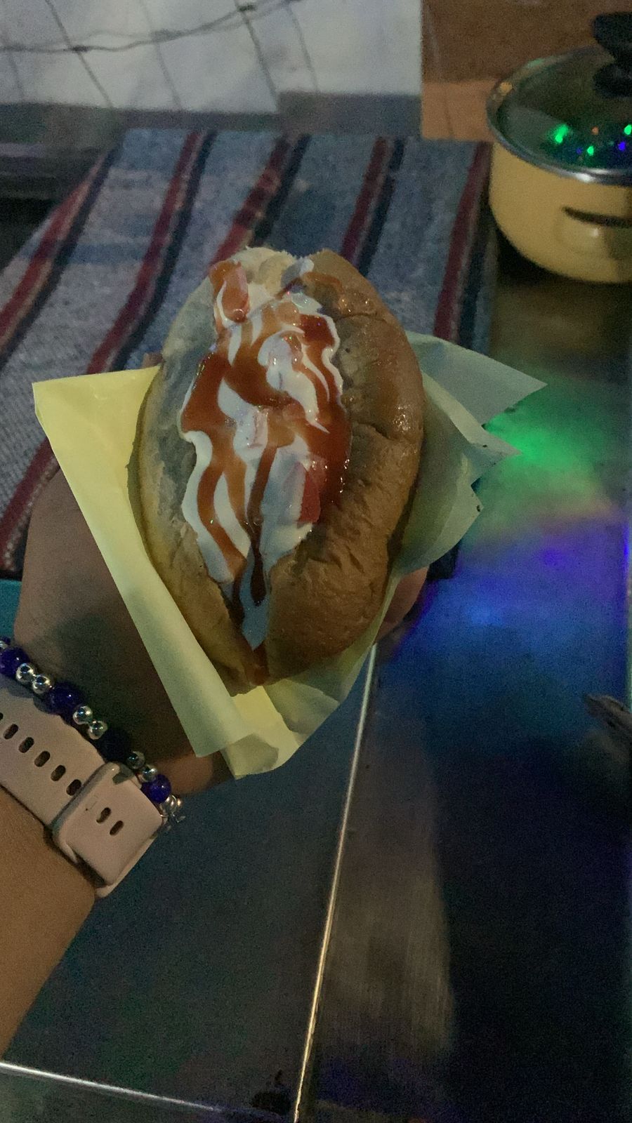 salchicha con tocino pan cebolla asada tomate crema y catsup