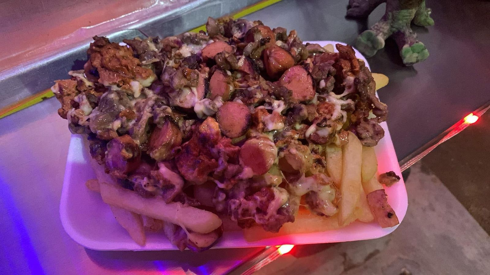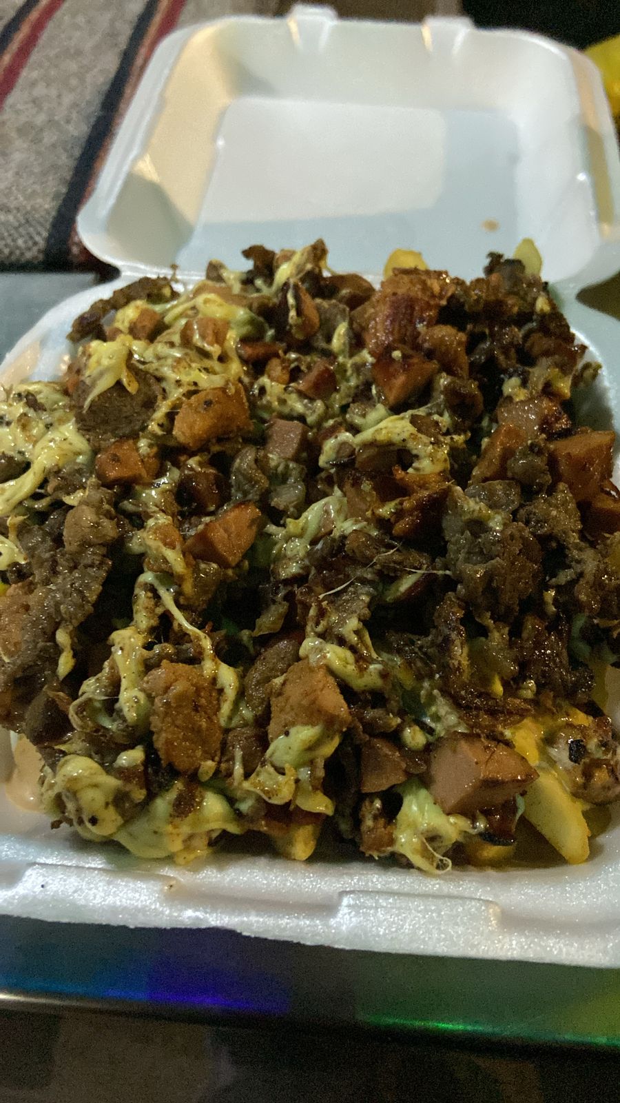 papas ala francesa carne asada carne pastor salchichas queso menonita gratinado crema catsup mostaza aderezo de chipotle queso para Nacho