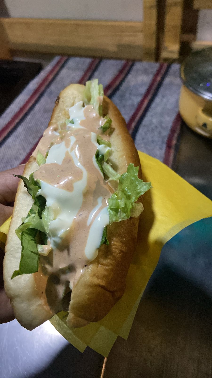 pan salchicha con tocino,queso menonita,queso amarillo carne pastor lechuga tomate crema y catsup