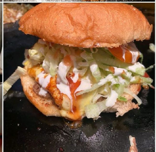 carne de hamburguesa queso amarillo y queso menonita gratinado en lechuga aguacate tomate salsa mostaza crema y catsup