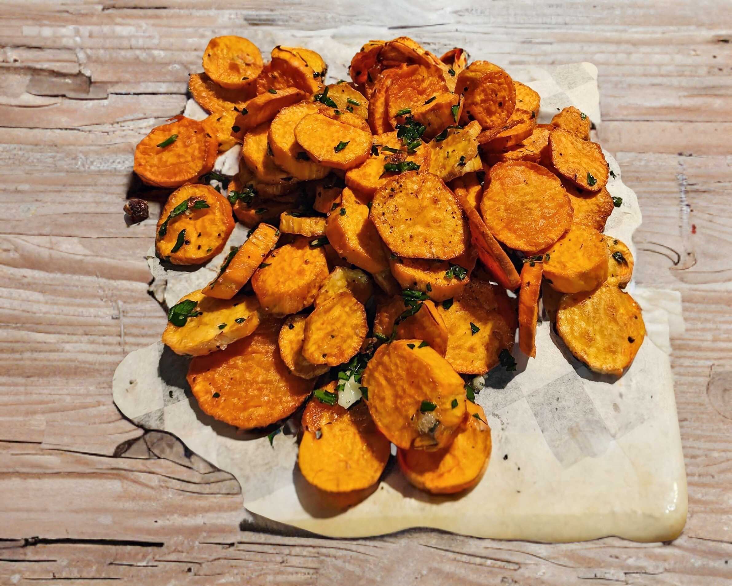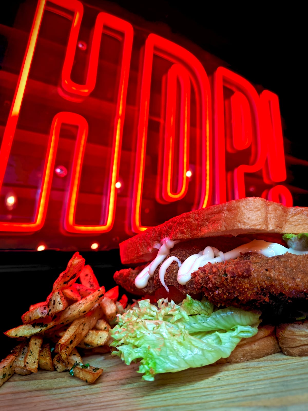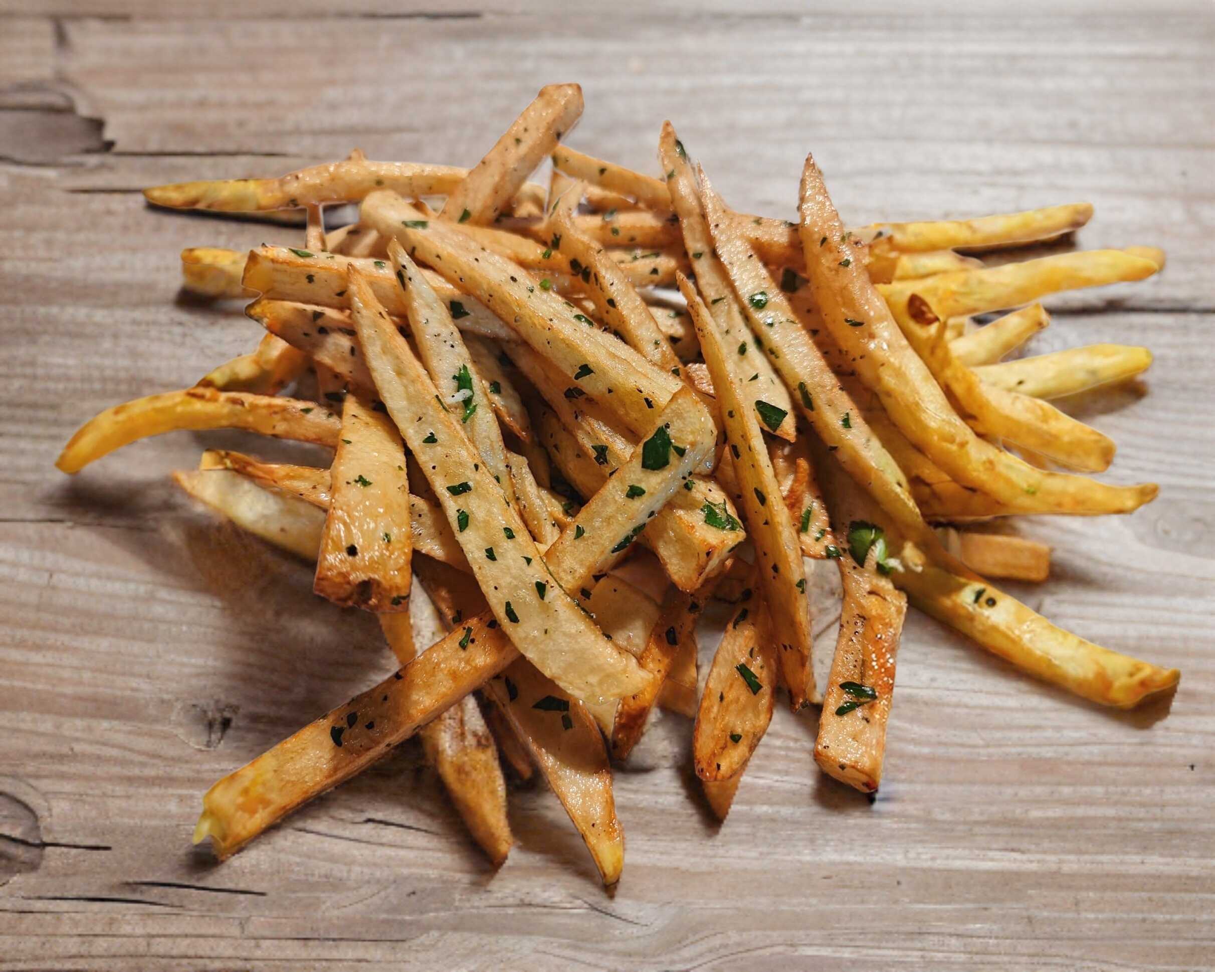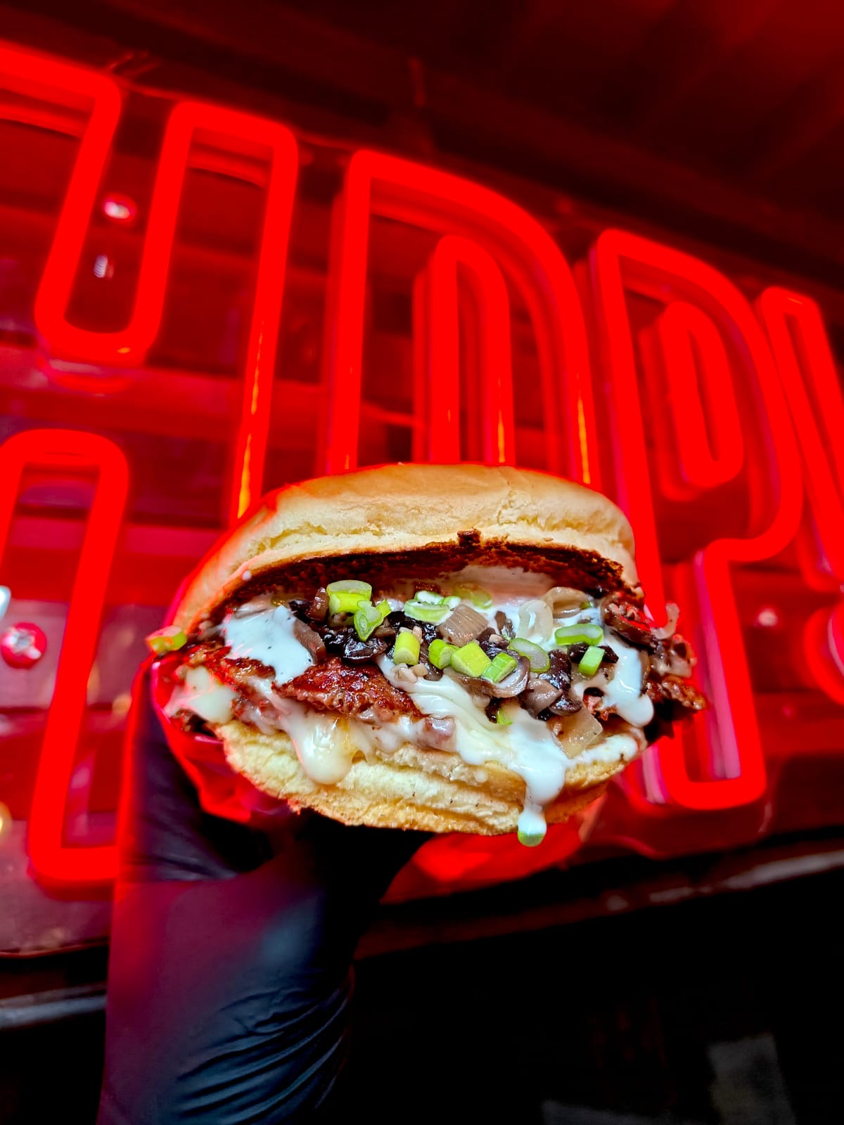 Doble carne smash, pan brioche, queso manchego, champiñones salteados con vino blanco, aderezo de queso azul y cebollín fresco (acompañada de papas provenzal)