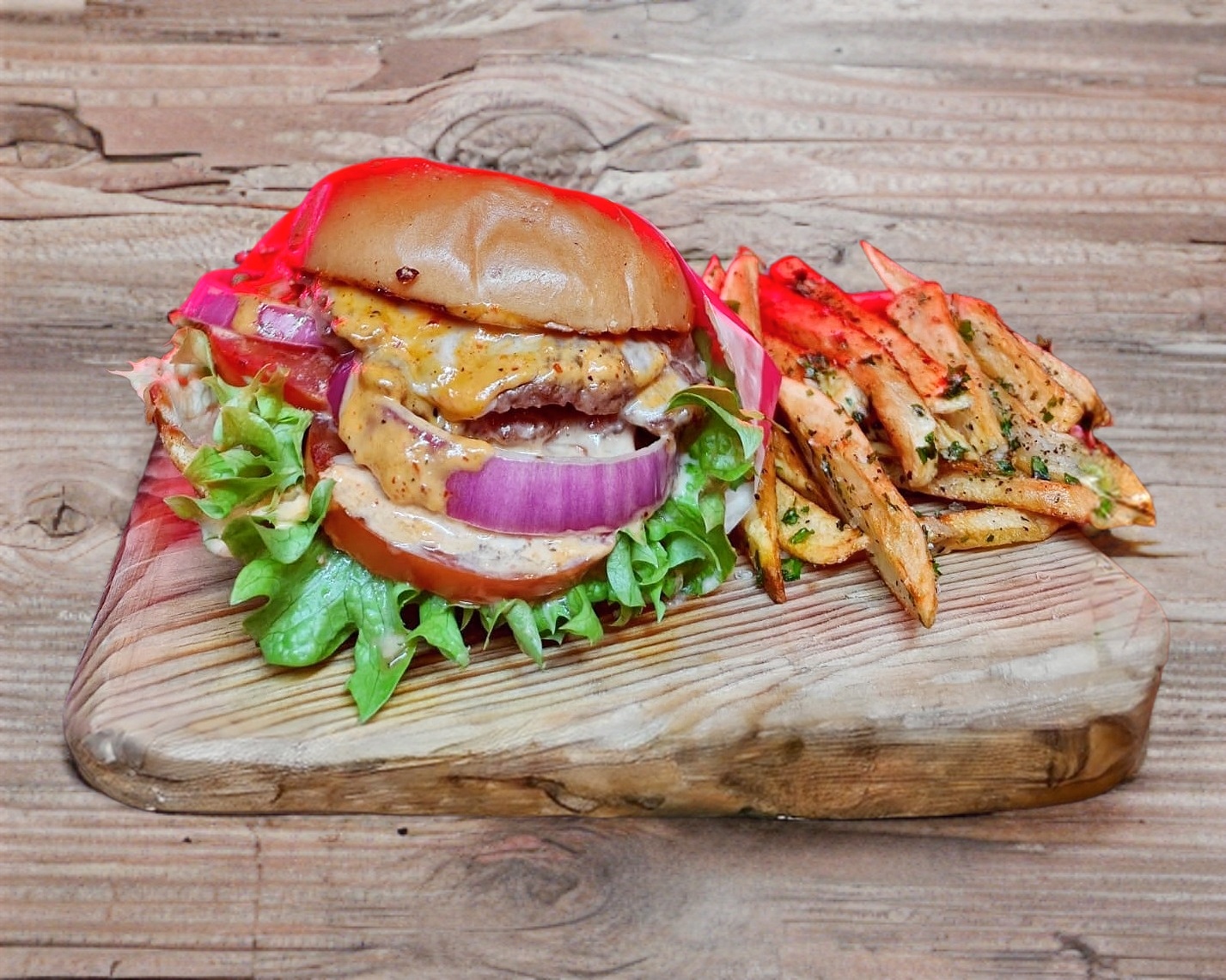 Doble carne smash, pan brioche, queso manchego, lechuga, tomates asados, cebolla morada y aderezo de la casa (acompañada de papas provenzal)