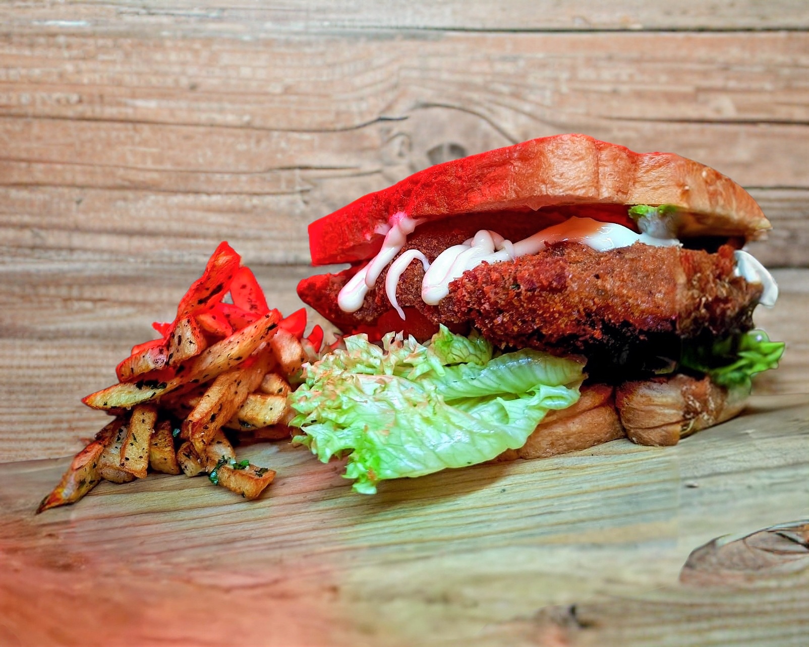 Milanesa de pechuga de pollo, pan e molde, lechuga, tomate, cebolla, aguacate, un toque de limón y mayonesa (acompañada de papas provenzal)