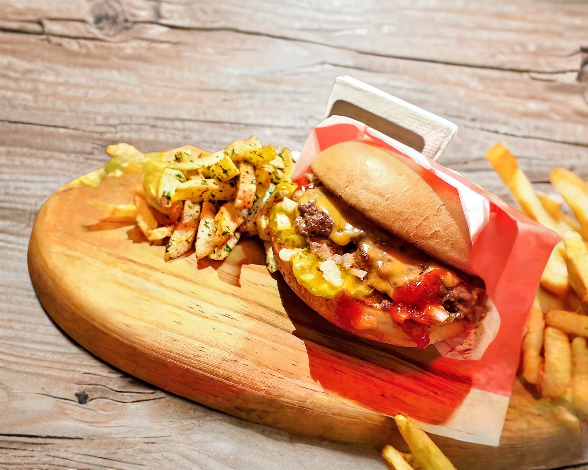 Doble carne smash, pan brioche, queso chédar, pepinillos, cebolla, kétchup y mayonesa (acompañada de papas provenzal).