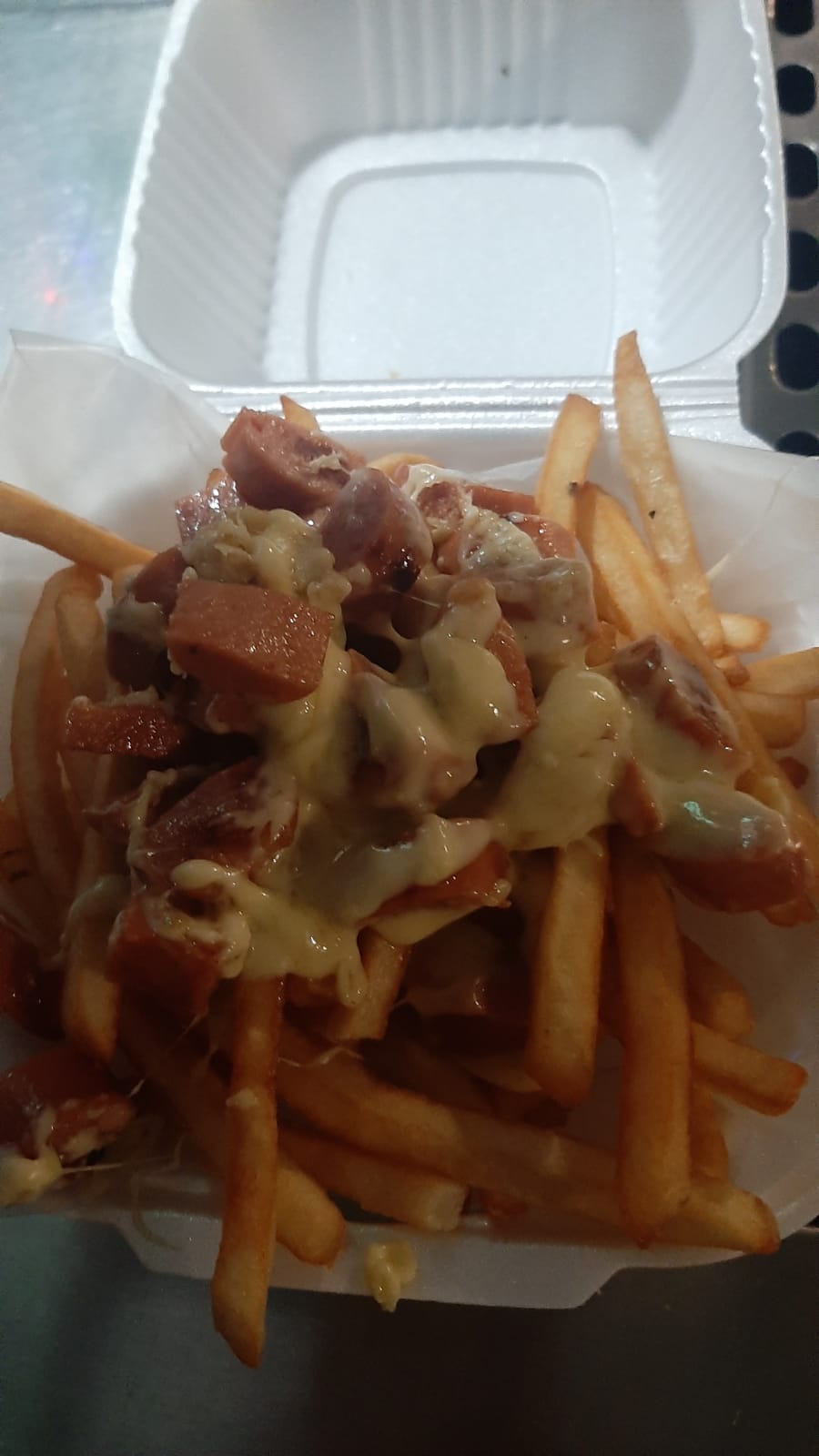 300 Gramos de papa frita, queso blanco gratinado, salchicha longmont, crema, catsup, mostaza y aderezo chipotle.
