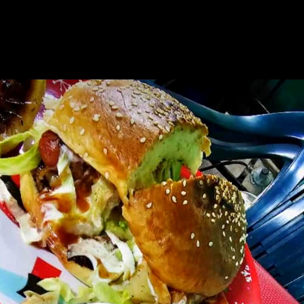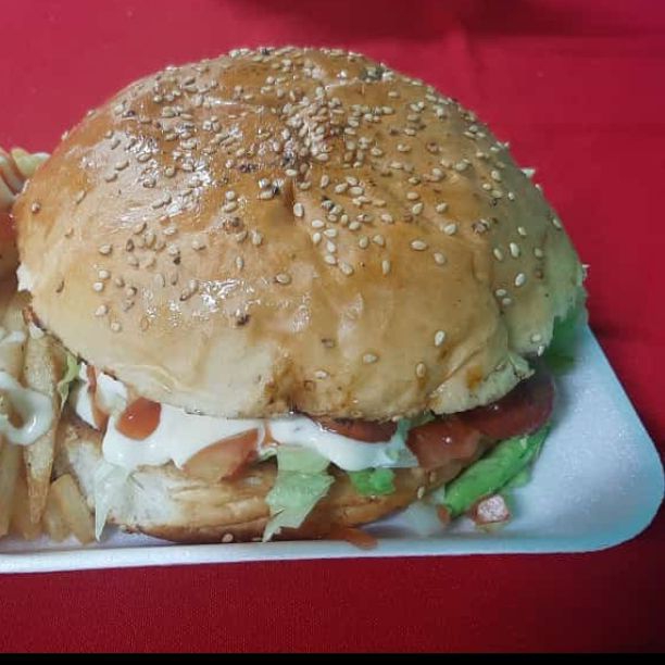 Rico pan casero, 150 gramos de carne de res, queso amarillo, cebolla, tomate, lechuga, aguacate, crema, catsup, mostaza y chile.