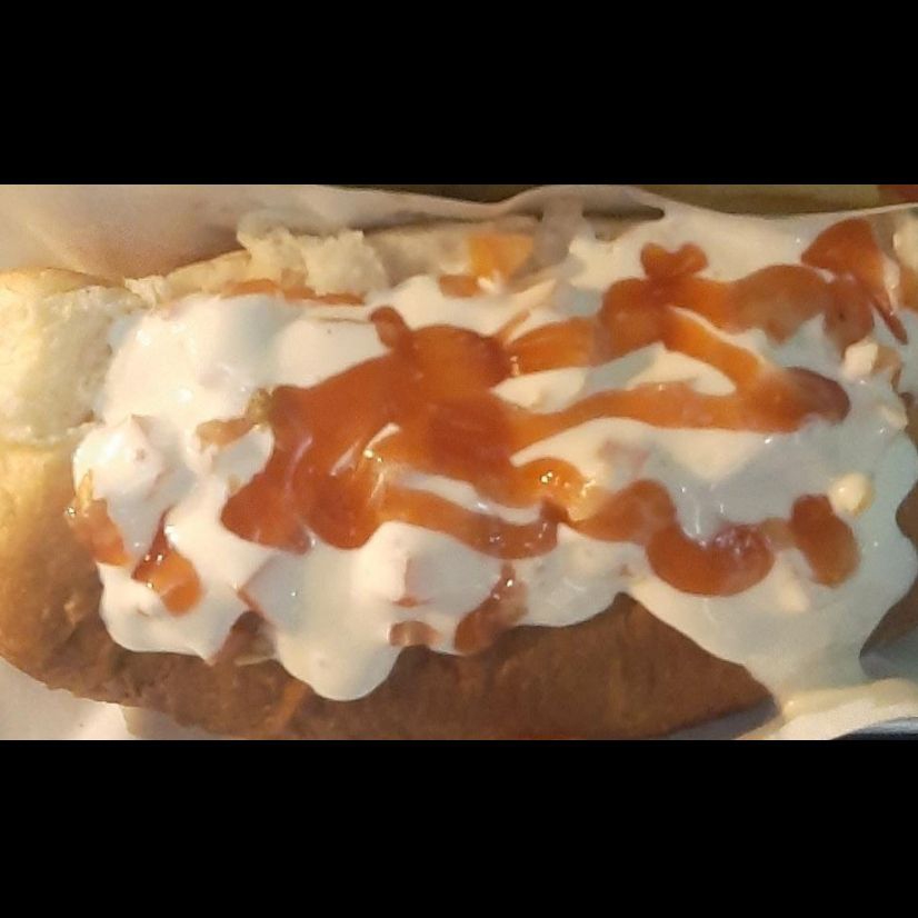 Preparado con pan casero acompañado con salchicha longmont, envuelta en tocino, cebolla, tomate, crema y salsas.