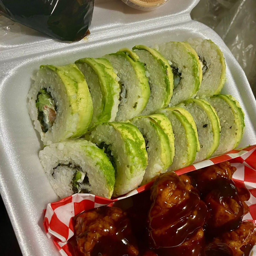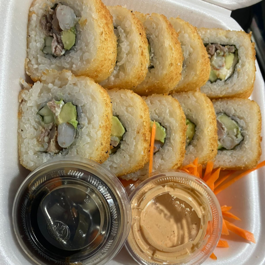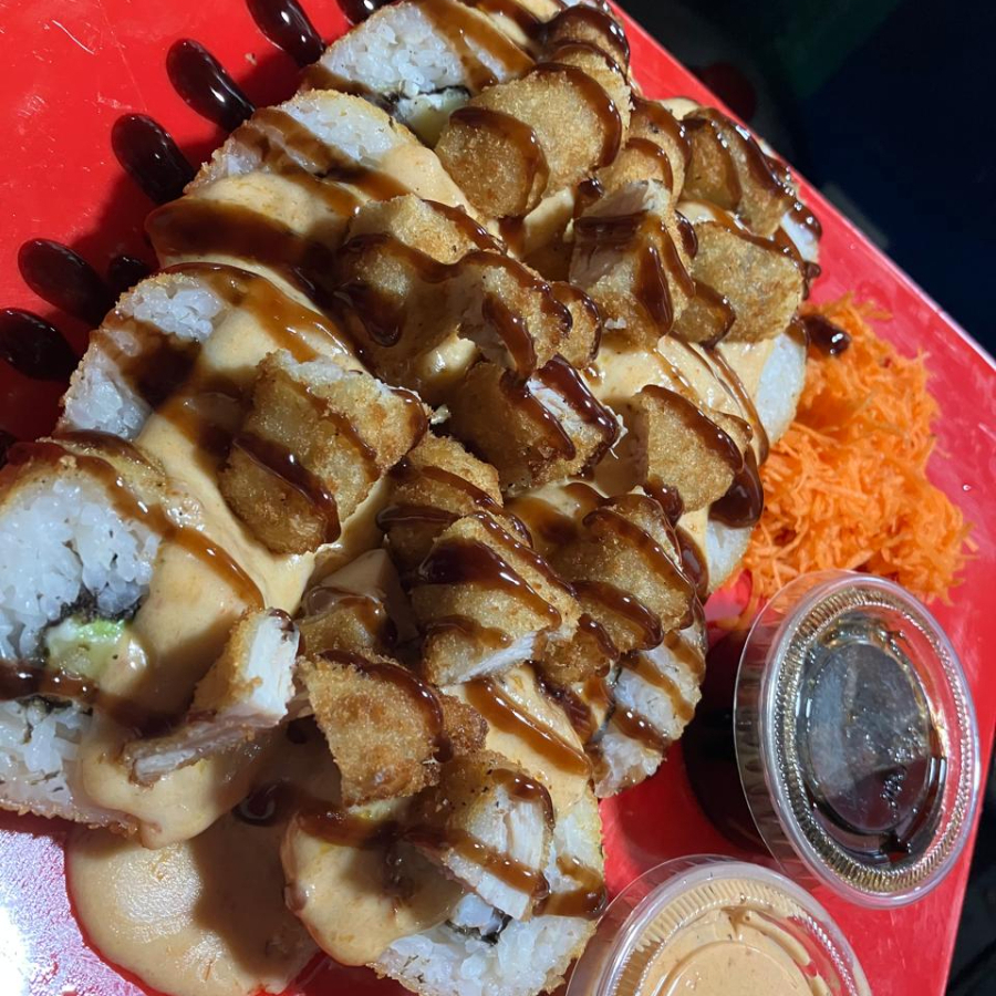 POR DENTRO: POLLO, RES, CAMARON, AGUACATE, PEPINO, ALGA Y PHILADELPHIA. POR FUERA: QUESO GRATINADO, POLLO CRISPY Y SALSA DE ANGUILA.