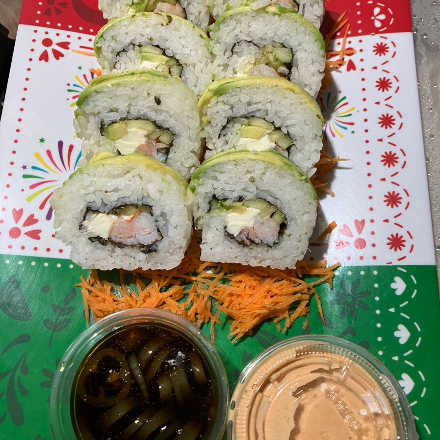 POR DENTRO: CAMARON, PEPINO, AGUACATE, ALGA Y PHILADELPHIA. POR FUERA: AGUACATE