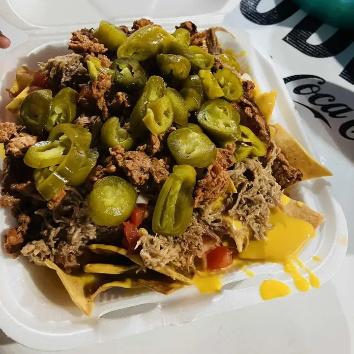 Totopos,queso nacho, carne asada,crema, catsup, chile jalapeño, aguacate y mexicana