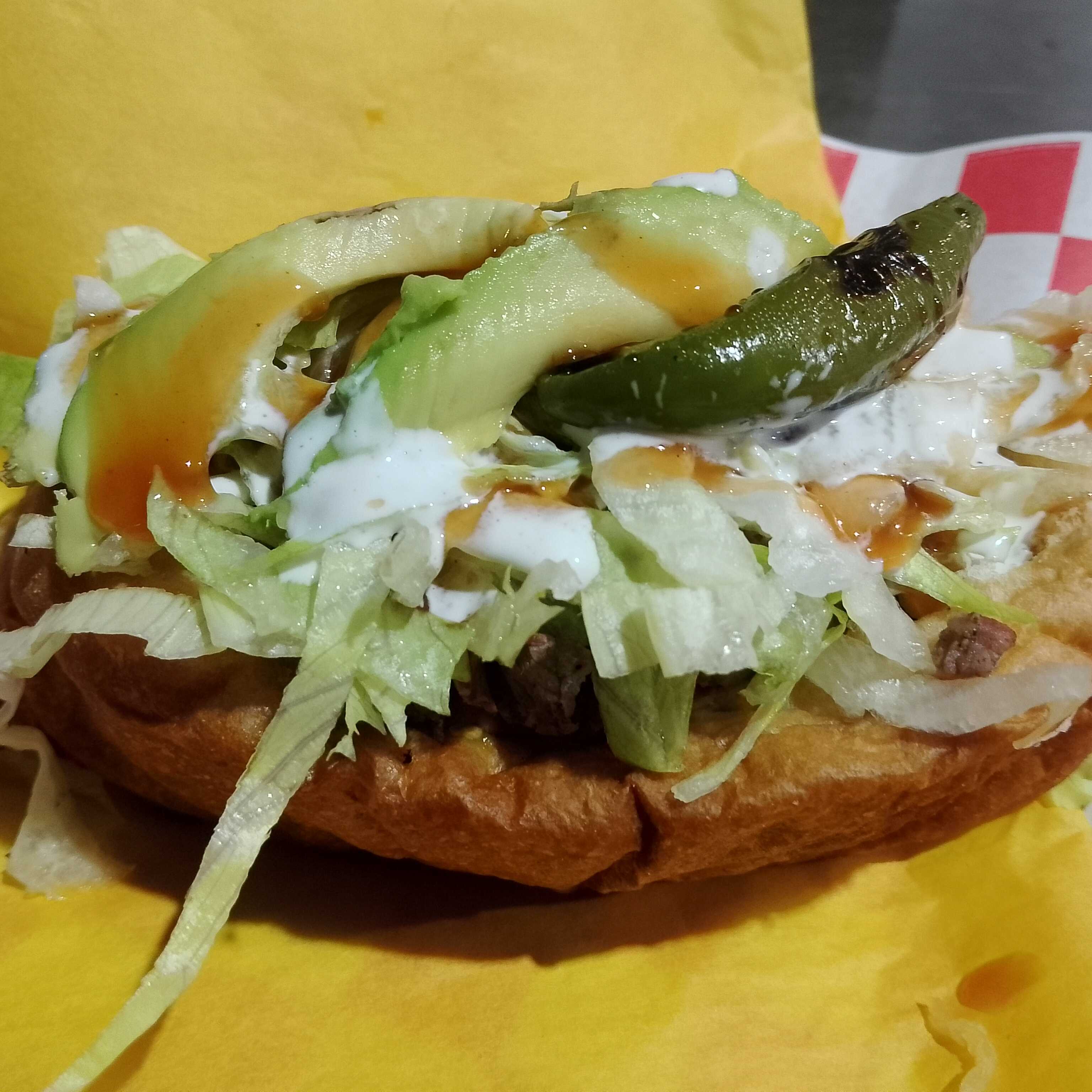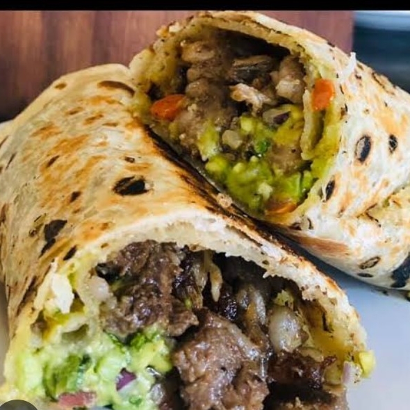 Tortillas grandes de arina ,carne deshebrada, cebolla, tomate, lechuga, mostaza,catsup,salsa y crema,aguacate