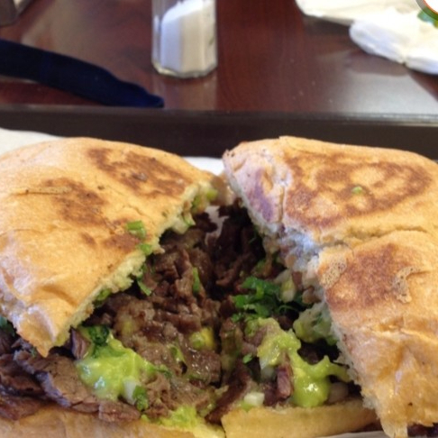Pan telera,crema,carne,cebolla, tomate, lechuga, aguacate y salsa